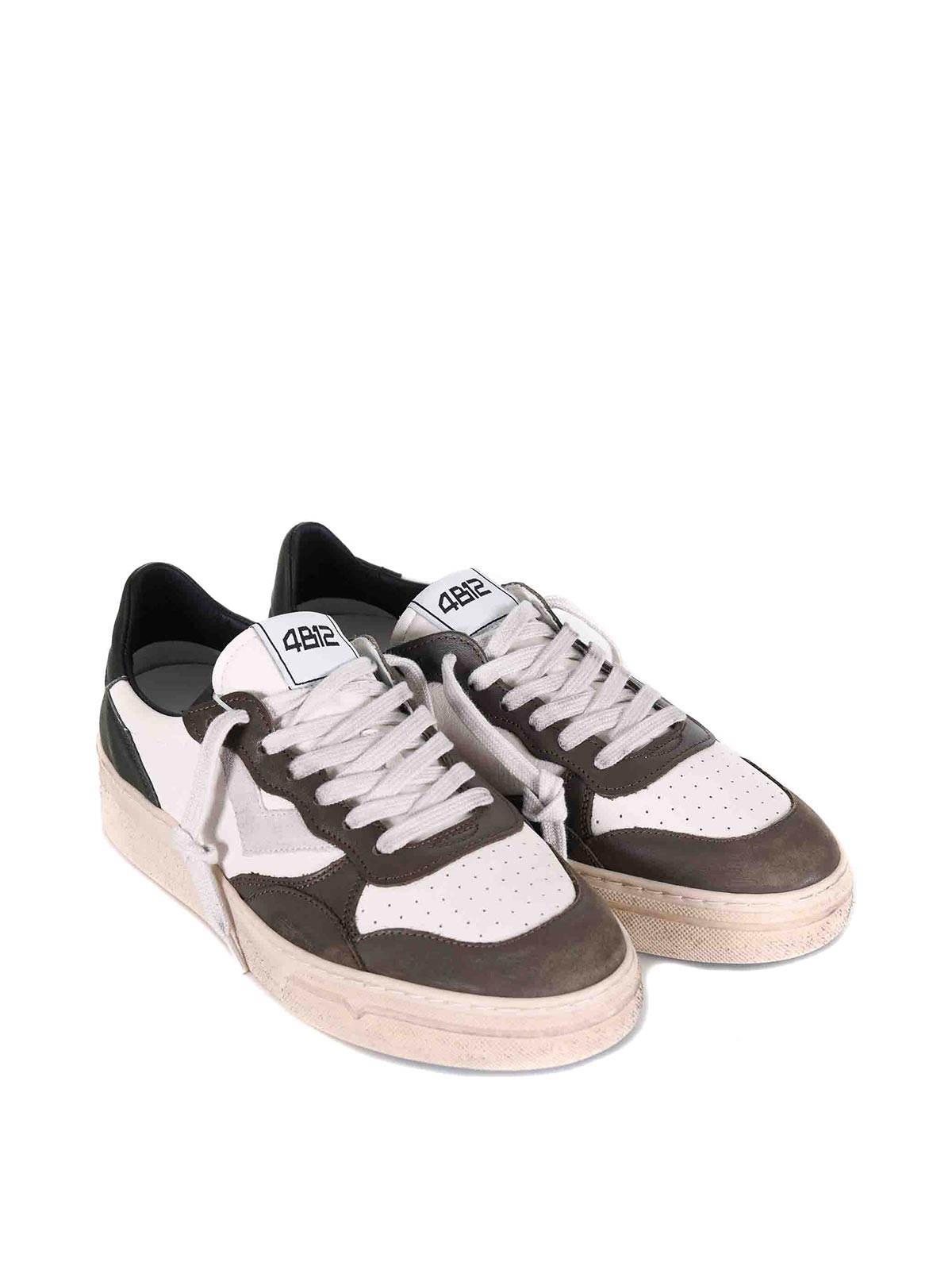 4b12 sneakers in white and military green leather. vintage effect with intentionally scratched and stained areas. intentionally stained laces. used-effect rubber sole with stained areas. size shown in photo: 41 100% leather