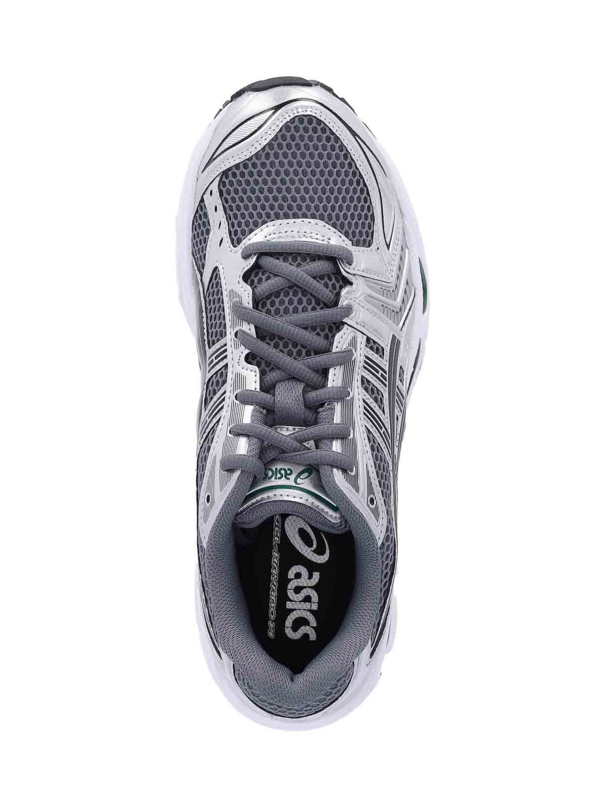 Asics gel-kayano 14 sneakers, in silver fabric, gray mesh details, round toe, lace-up closure, black logo patch on tongue, black side inserts, side green logo print, back green tab logo print, textured rubber sole.