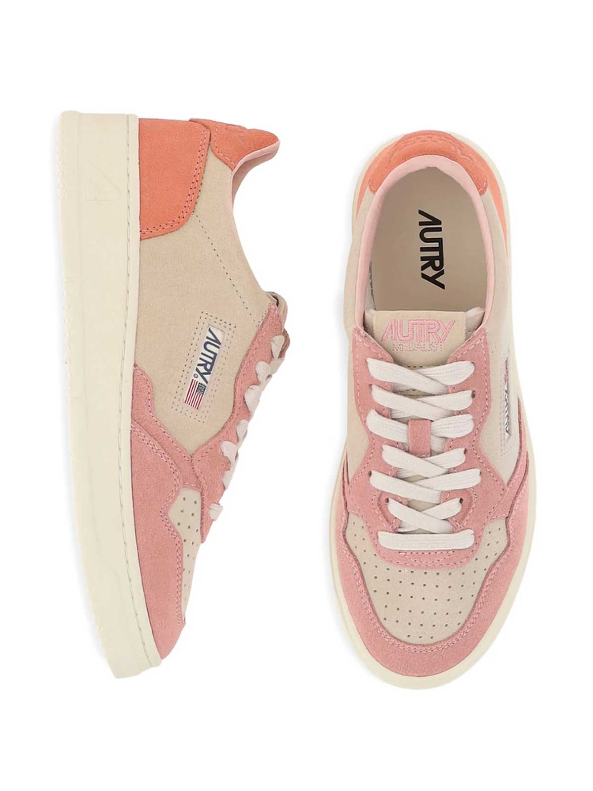 Beige, pink, and orange suede upper rubber sole low-top style
