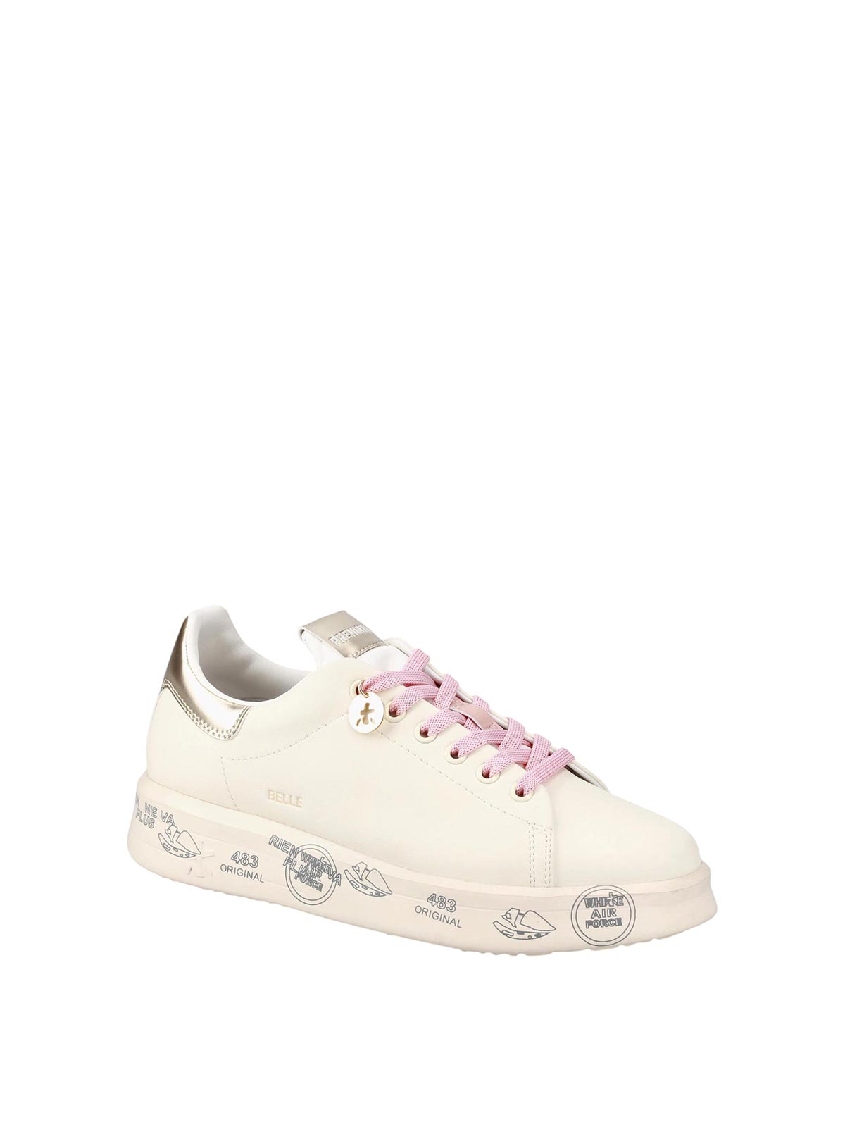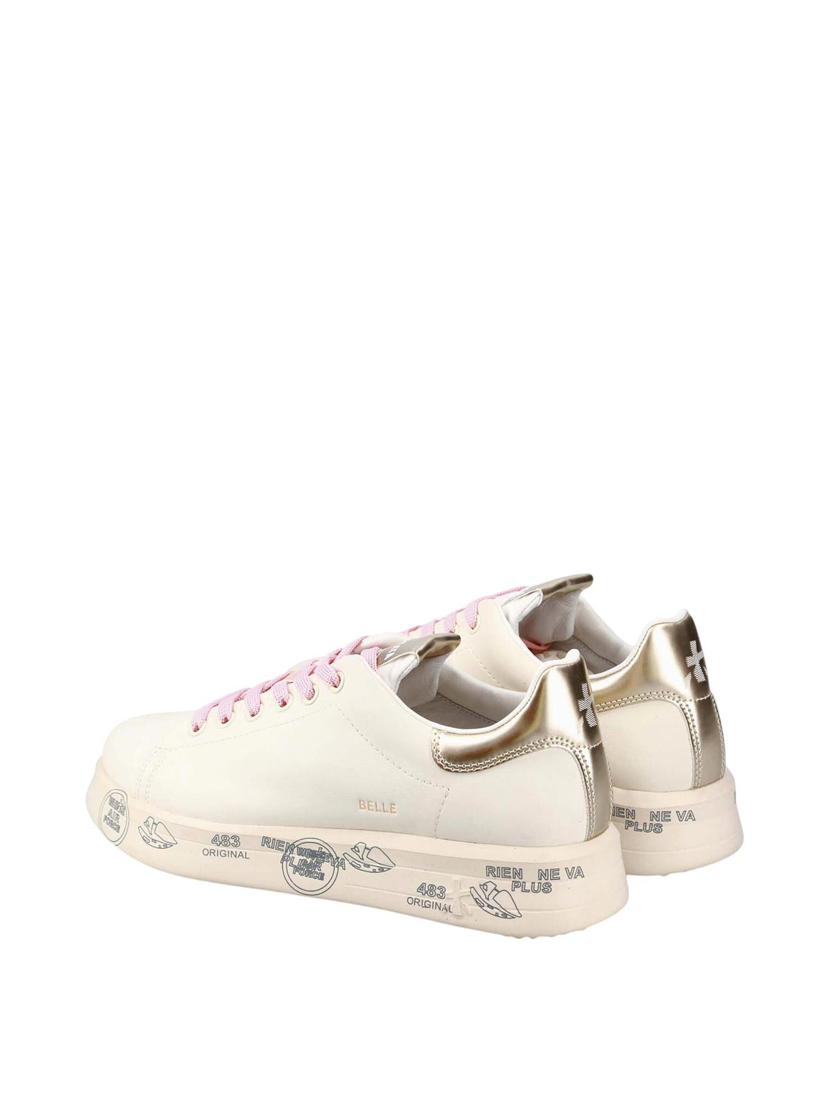 Premiata belle var sneaker / white and gold metallics the belle var sneaker by premiata combines clean and refined lines made of white with heel tab and golden metallics enriched with pink laces that give a distinctive feminine touch the iconic with premiata graphics completes the contemporary design making this shoe a perfect balance between elegance and urban style a versatile sneaker ideal for casual chic looks and outfits with a unique character & fit upper with golden metallics pink laces with logo charm in soft light goat leather with and graphics awarded with gold and pink regular fit