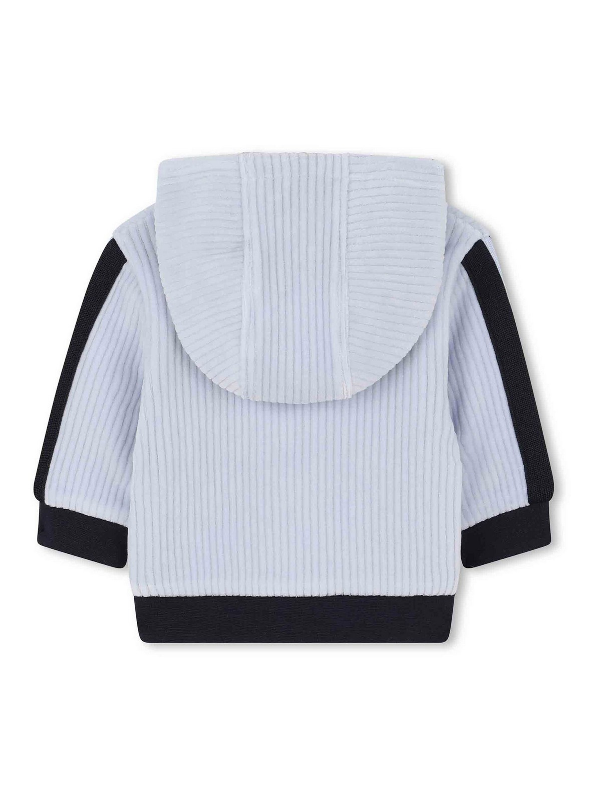 Light blue hooded design with navy zip at hems at the ankles / side pockets