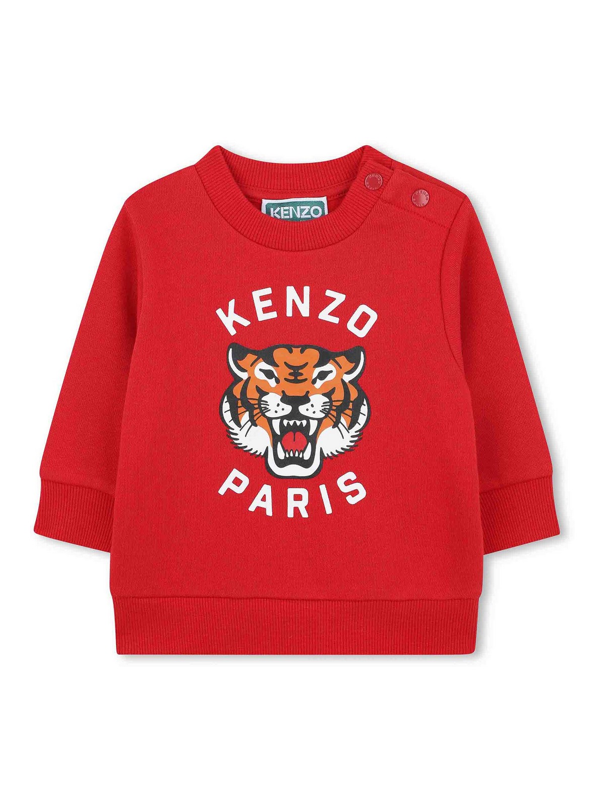 Logo tracksuit features red tiger graphic design sweatshirt crew neck ribbed hem and cuffs snaps on the shoulder trousers elasticated waist ribbed hems