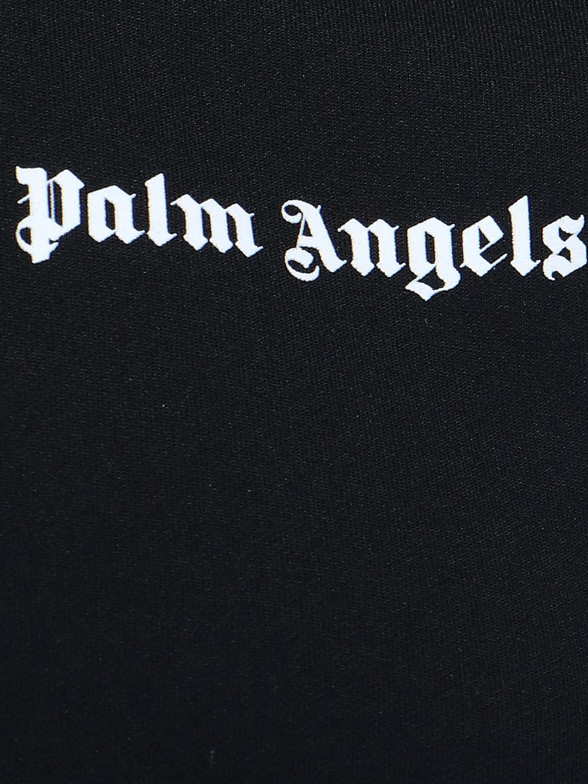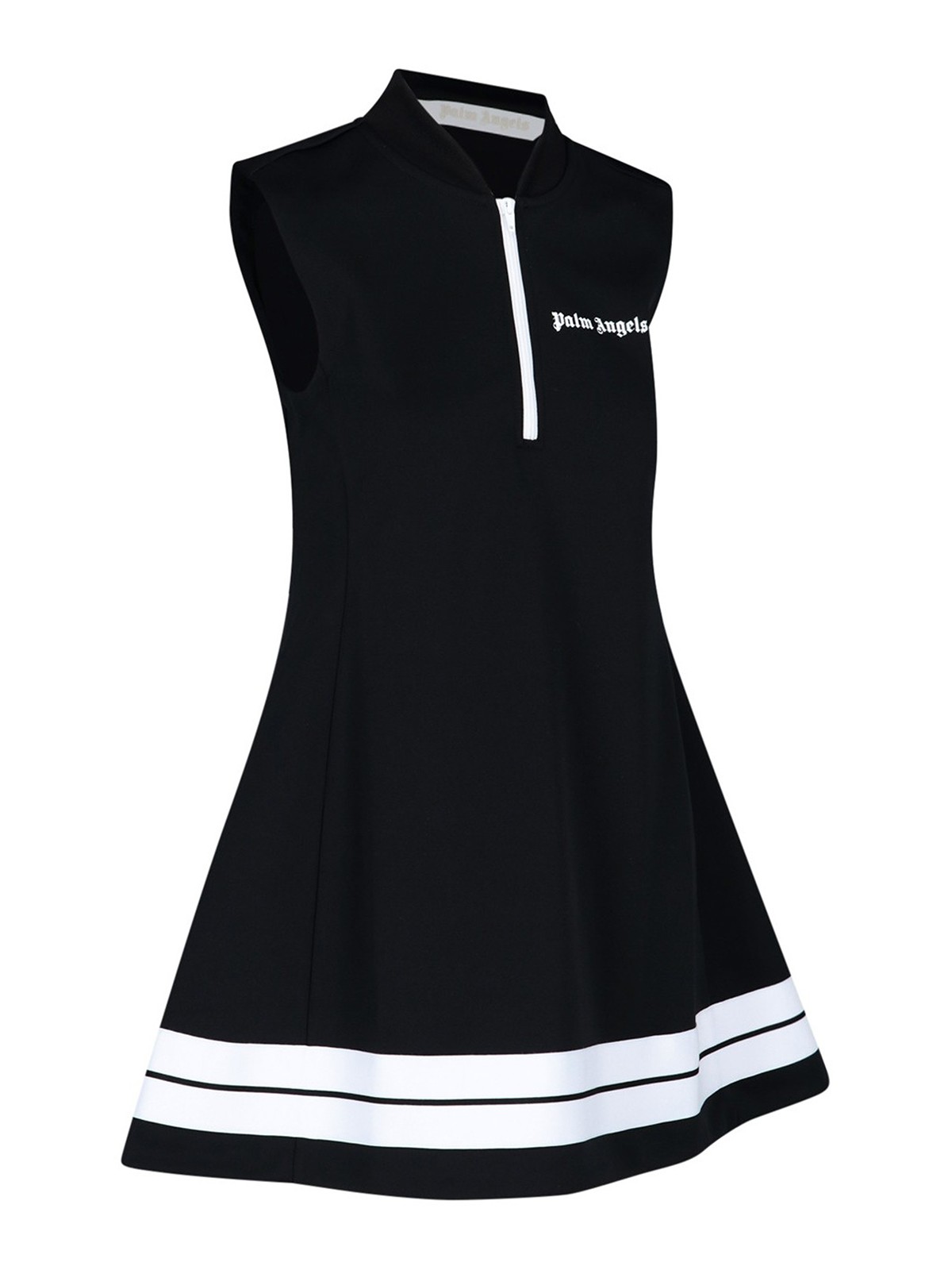Mini sporty dress, black color, adjustable neckline white zipper front, wing sleeves, logo lettering front, lower contrasting stripes, curved hem.