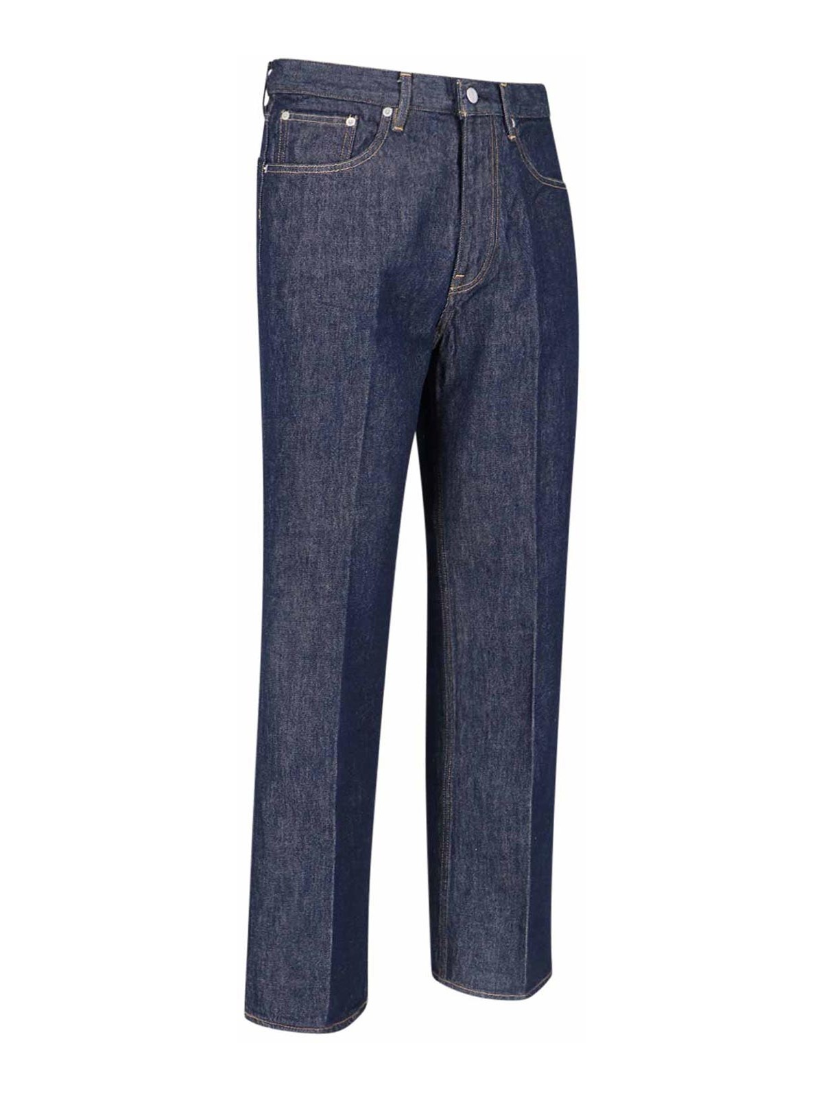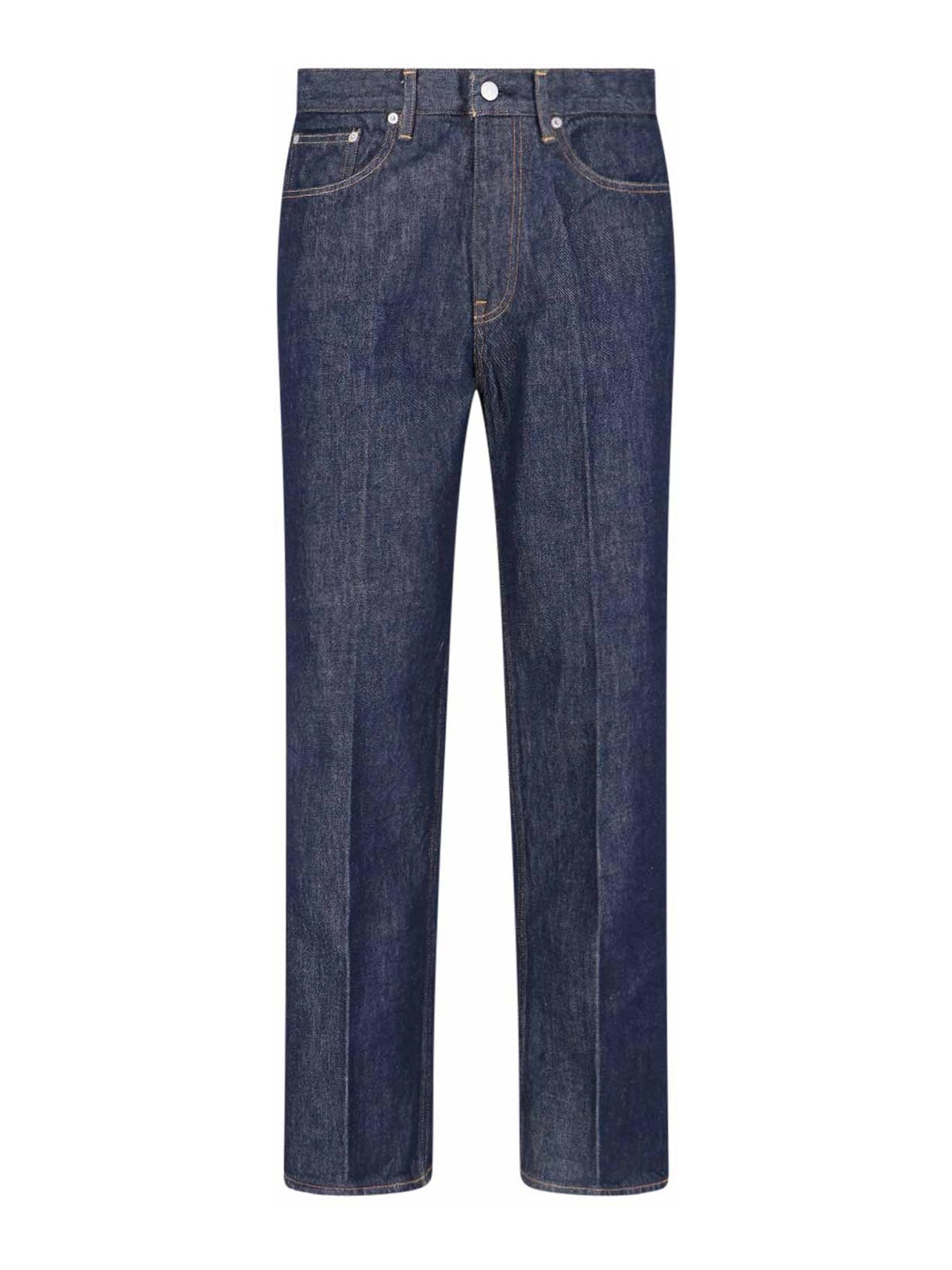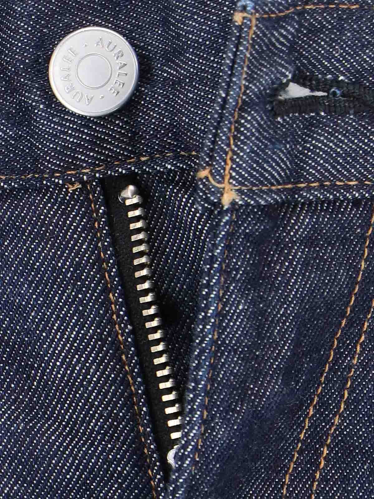 Auralee straight jeans, in blue denim, medium waist, belt loops, button and zip closure, five pocket design, two pleat details on the front and back.