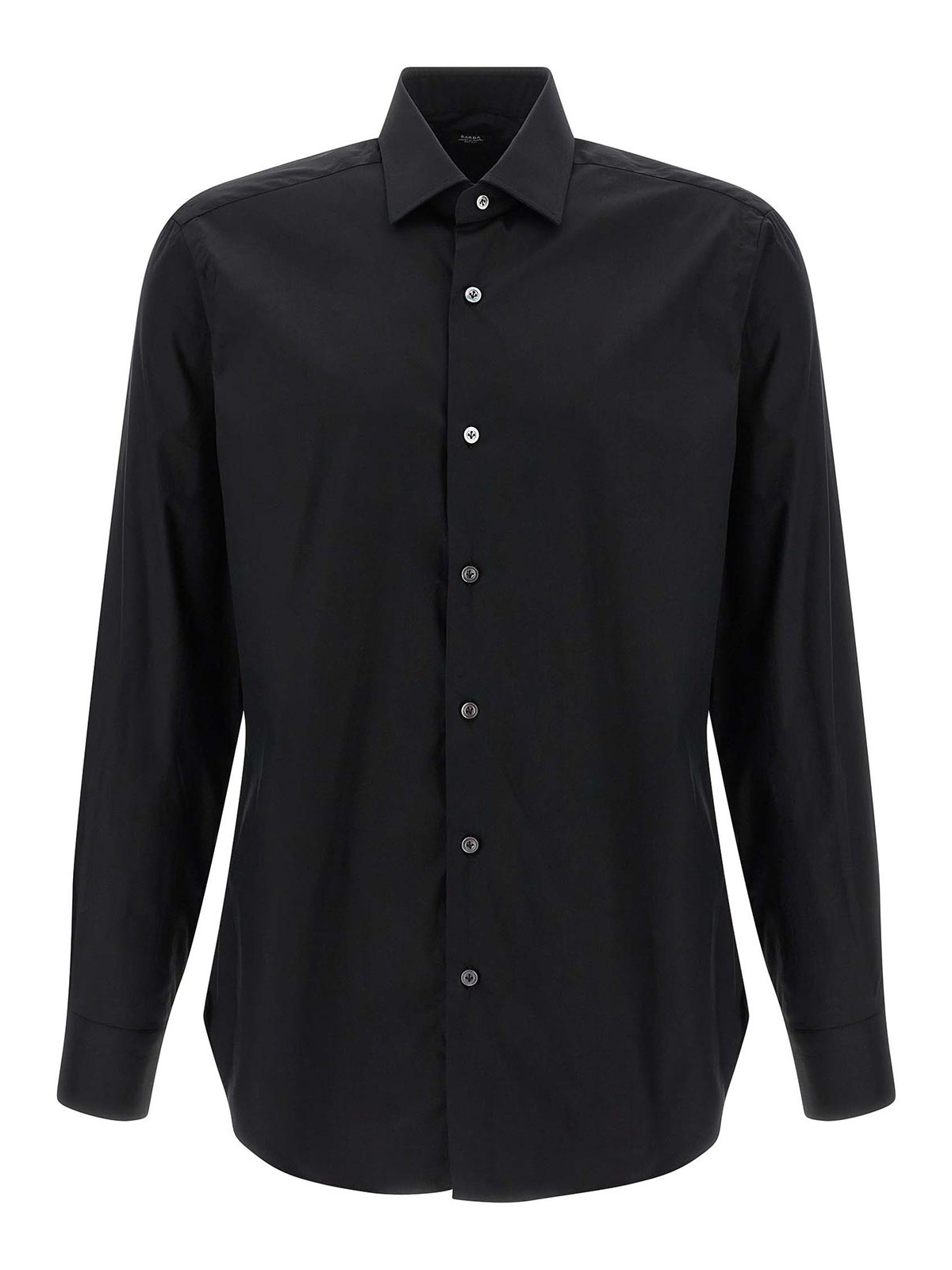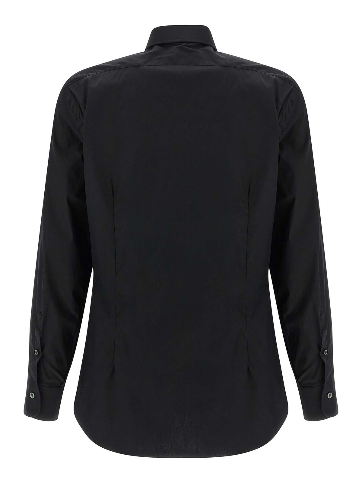 Stretch cotton poplin shirt with front button closure, long cuffed sleeves.