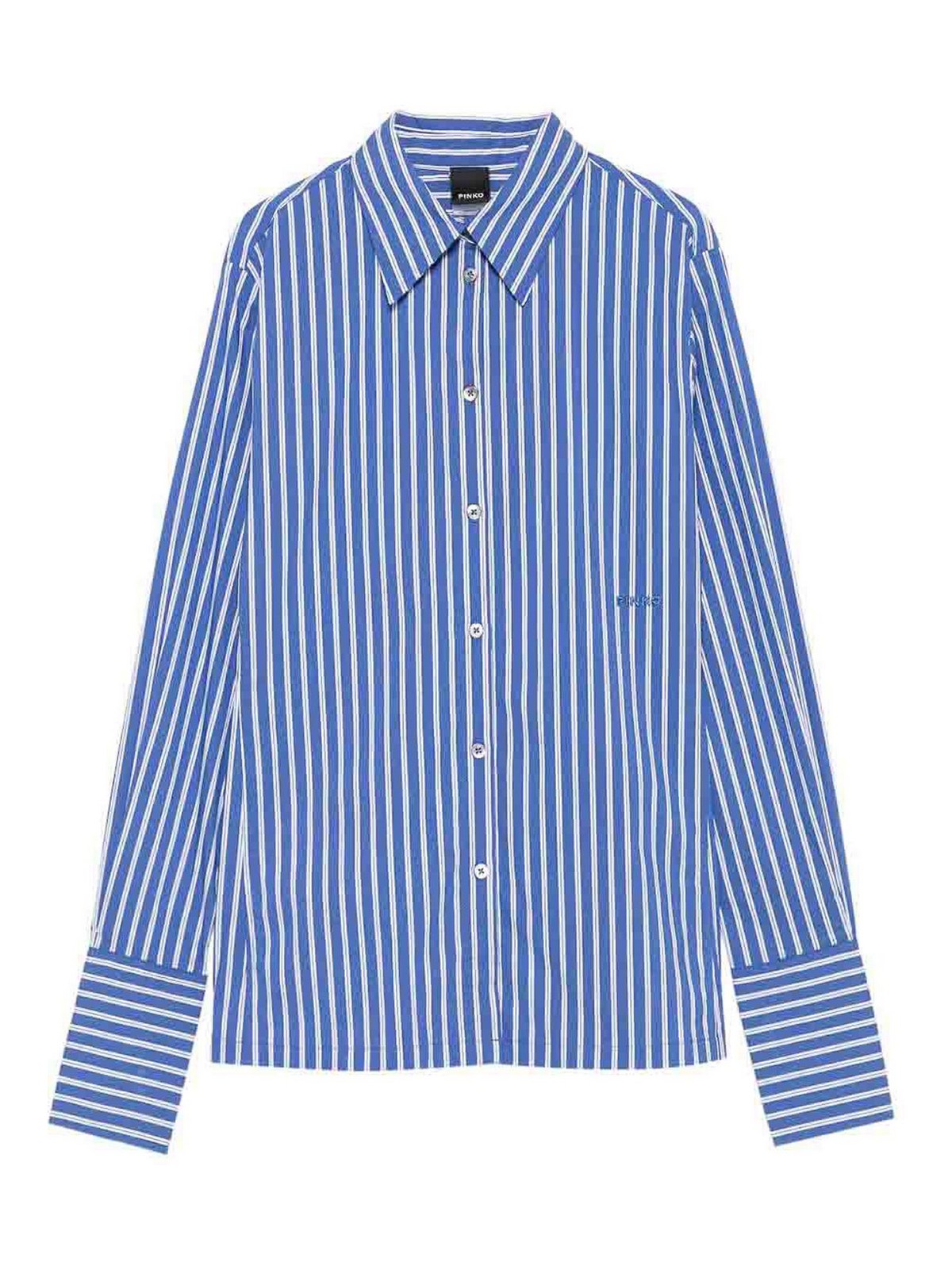 Cathleen striped shirt features blue and white striped pattern with buttons long sleeves buttoned hems pointed collar