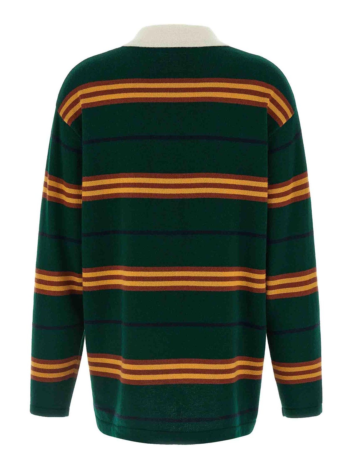 striped rugby' striped cashmere polo shirt with concealed collar and buttons, long sleeves with dropped shoulder, side slits, and asymmetric hem.