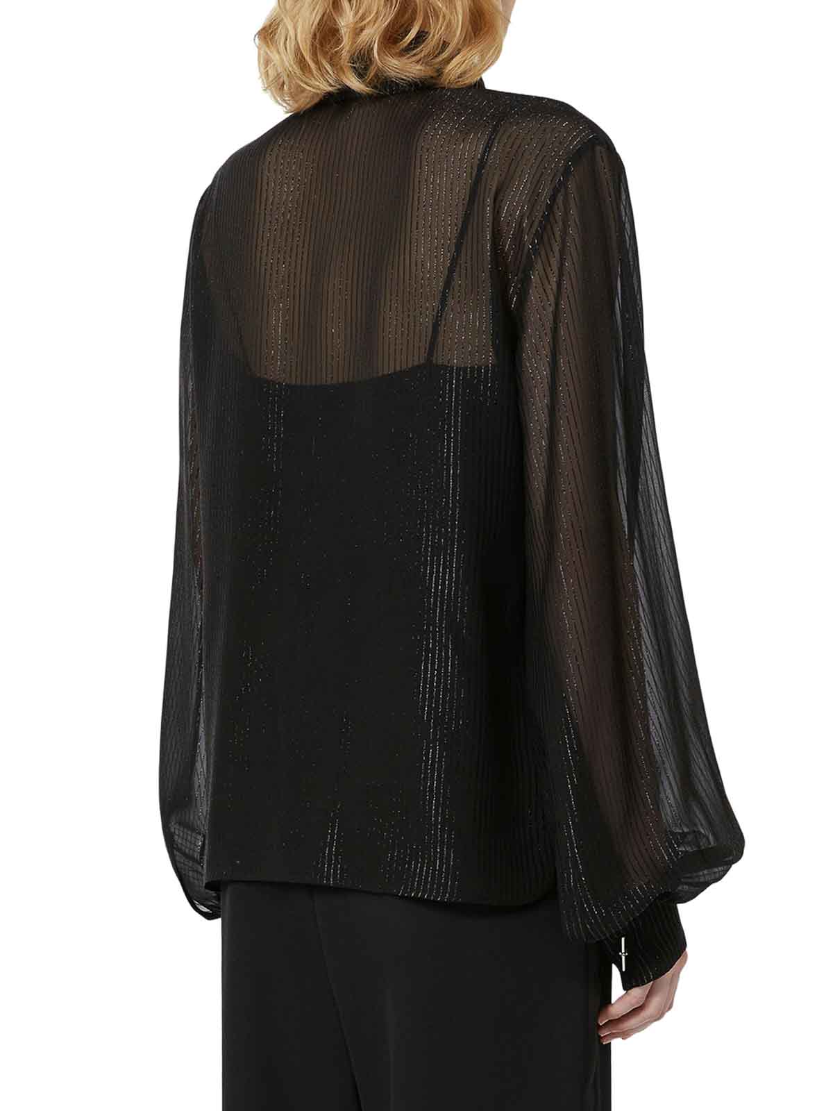 Feminine blouse with a removable bow tie at the, chiffon blouse with a lam stripe design, flowing fit, shirt collar and jeweled cuffs, long loose, fitting sleeves, concealed with mother, of, buttons, side slits and rounded hem, matching slip top, color black