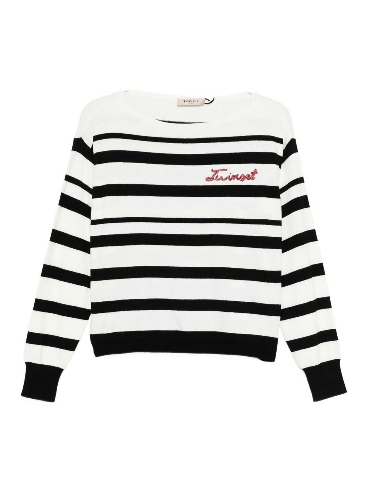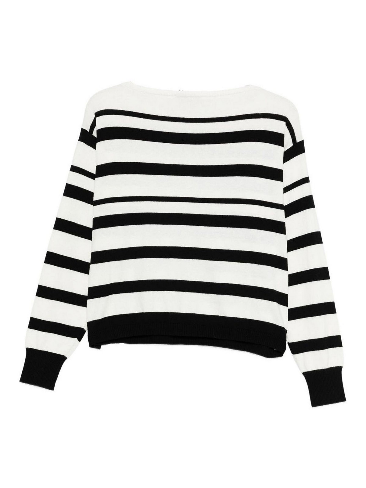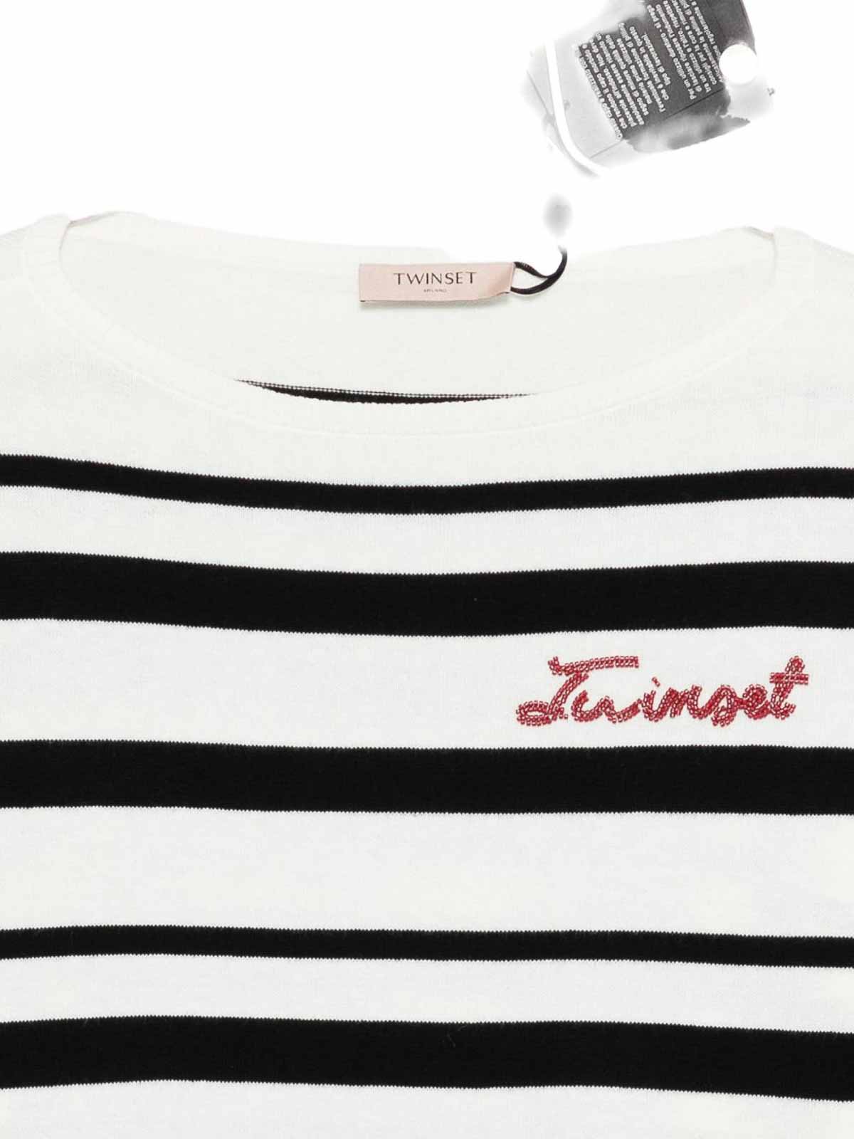 Black and white horizontal striped pattern, long sleeves, decorated logo, ribbed hem and cuffs