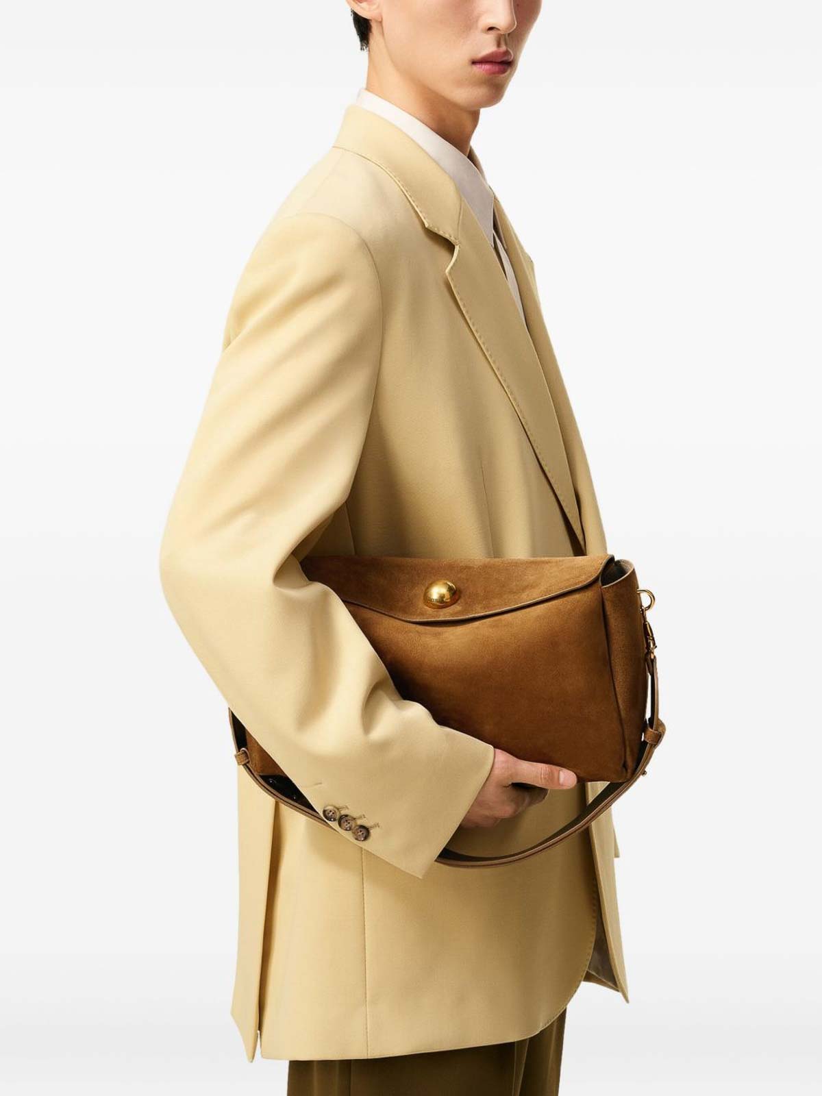 Hazelnut brown suede leather adjustable strap magnetic flap closure metal hardware