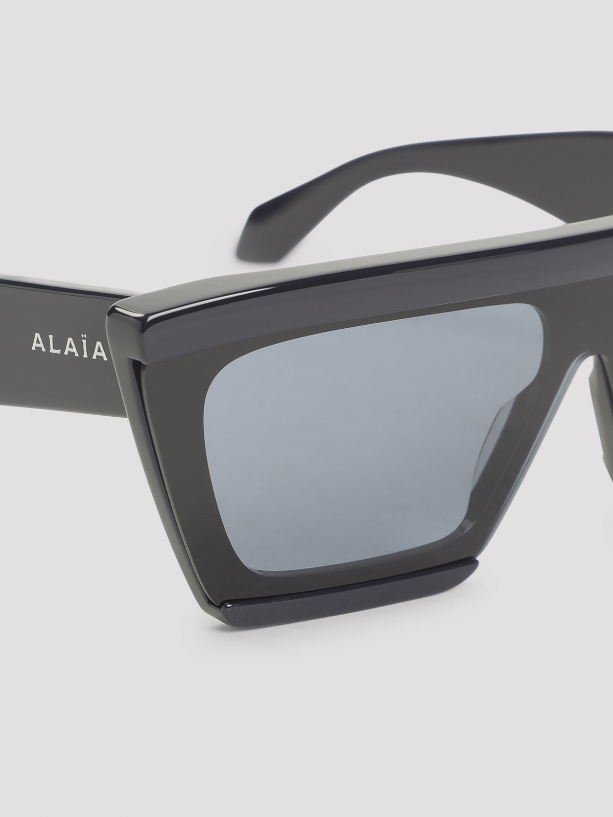 Alaa eyewear blue acetate sunglasses. pure blue acetate sunglasses, geometric tonal frames, blue lenses, side silver-tone lettering logo, tonal temples.