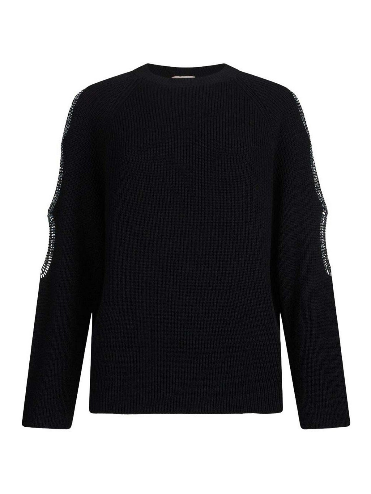Black crew neck cut, out bejewelled embellishment blend ribbed knit
