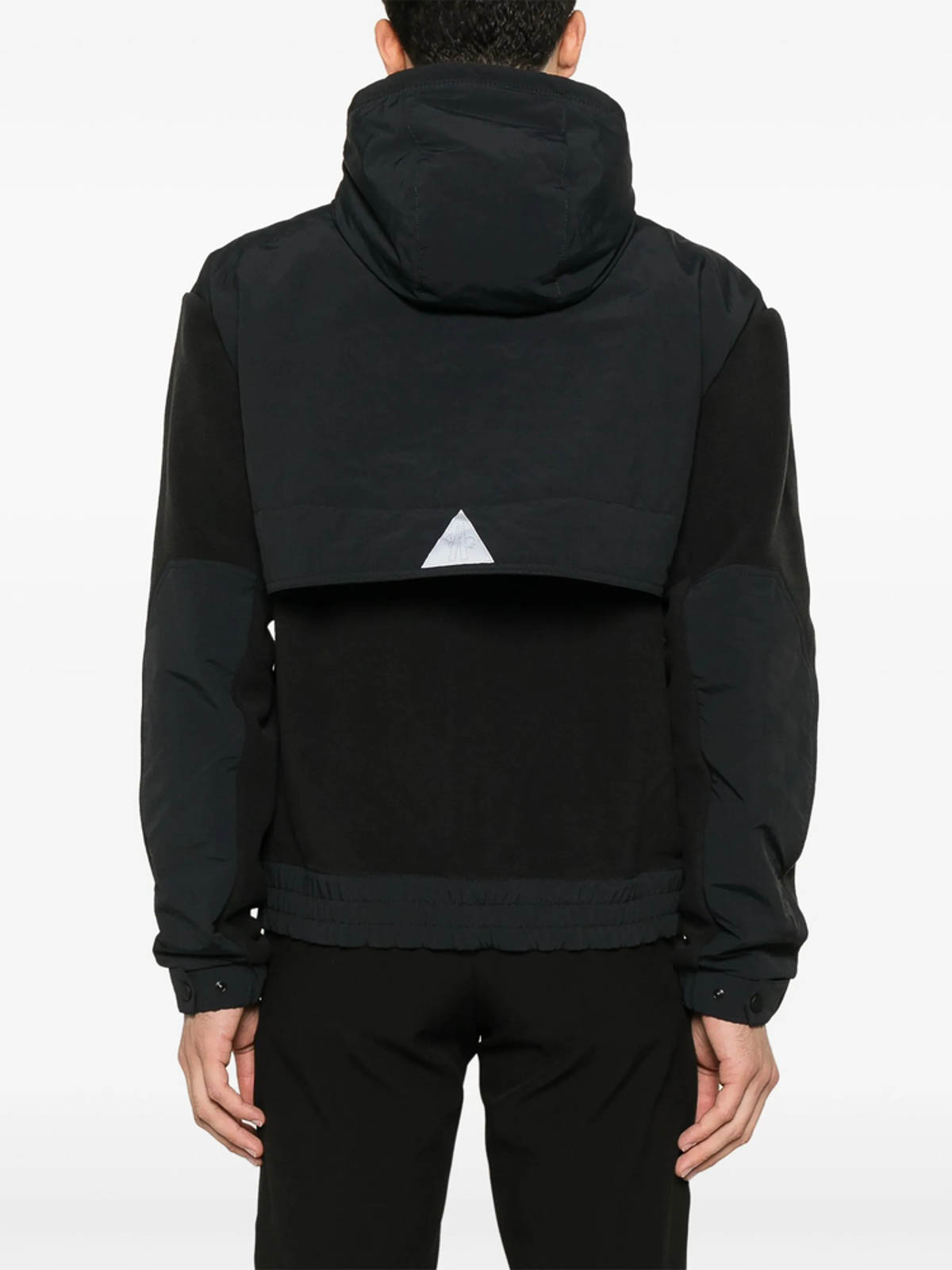 Black fleece texture two-way zip slouchy drawstring hood long s logo patch at the press-stud cuffs two pouch pockets mini logo tag storm flap reflective detailing elasticated hem