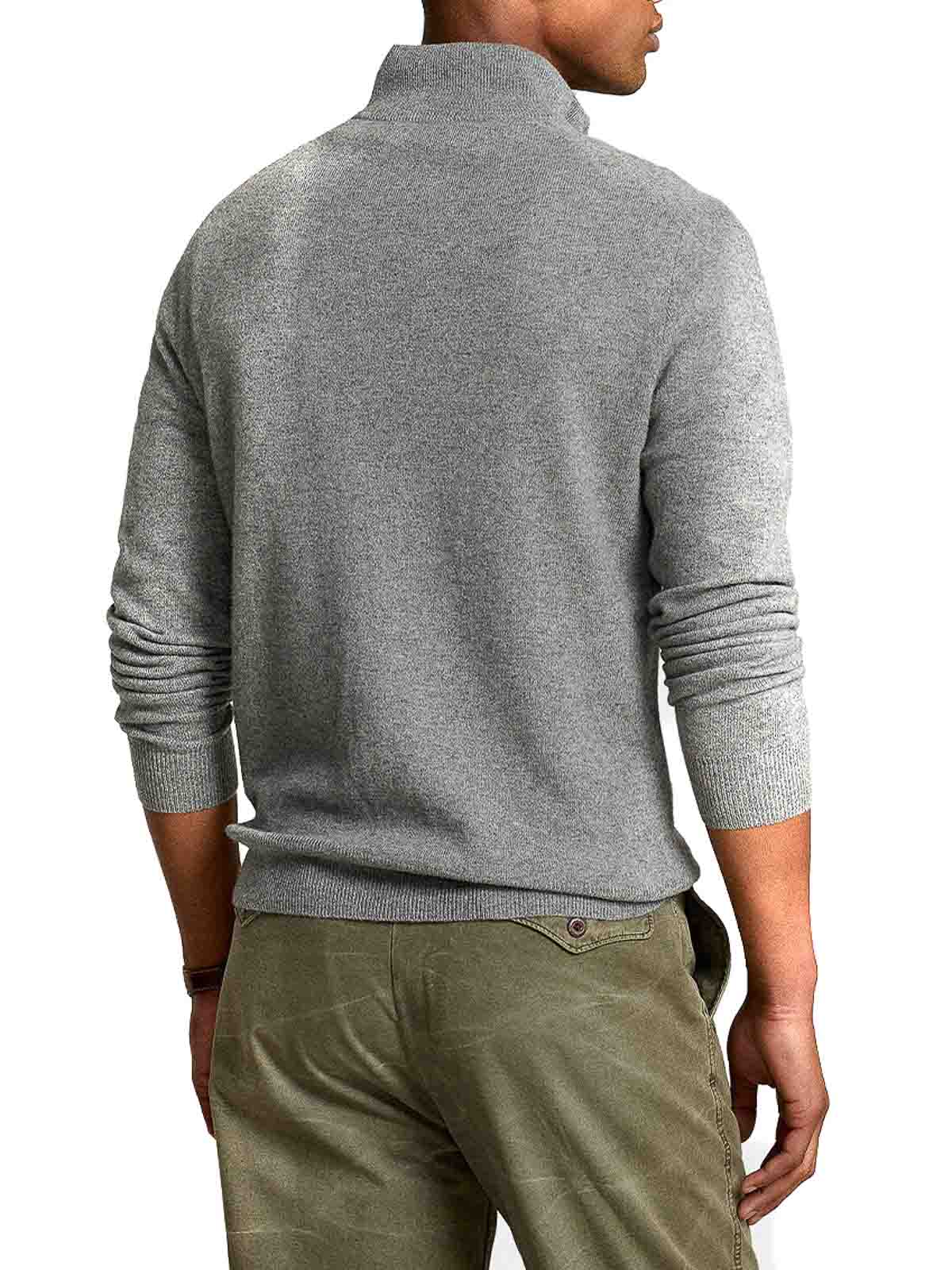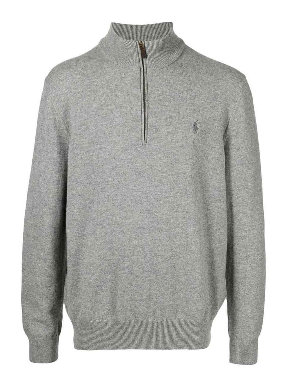 Grey jumper from polo ralph lauren featuring long sleeves, high neck, embroidered logo at the chest, ribbed cuffs and hem, short front concealed zip fastening