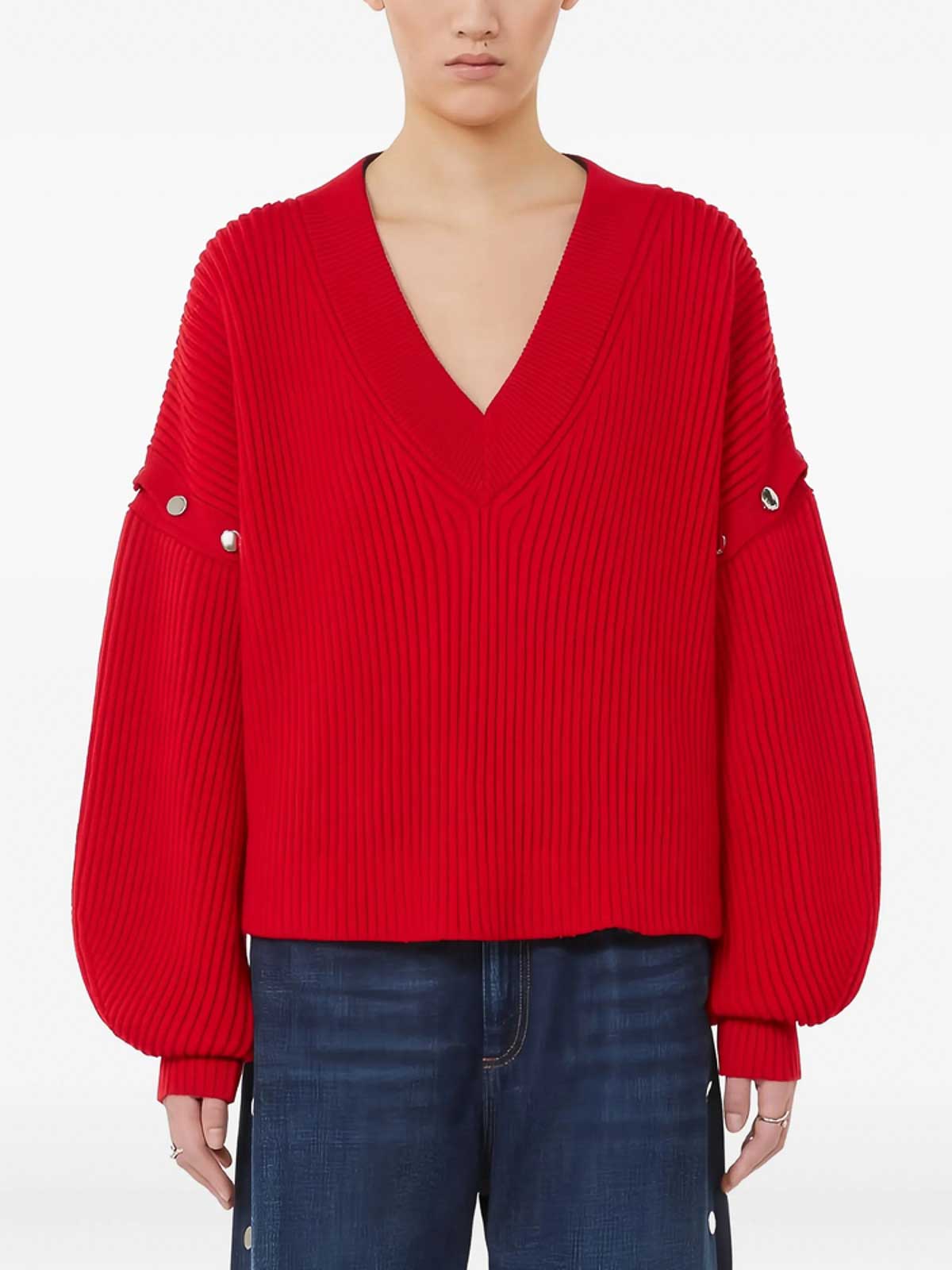 Red v-neck ribbed knit balloon sleeves convertible sleeves