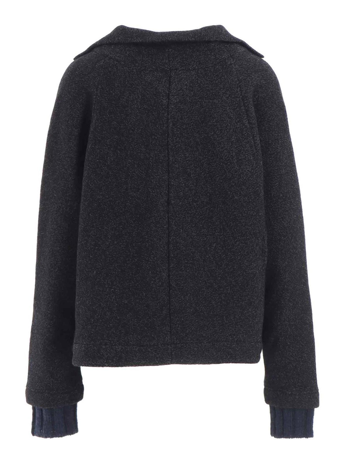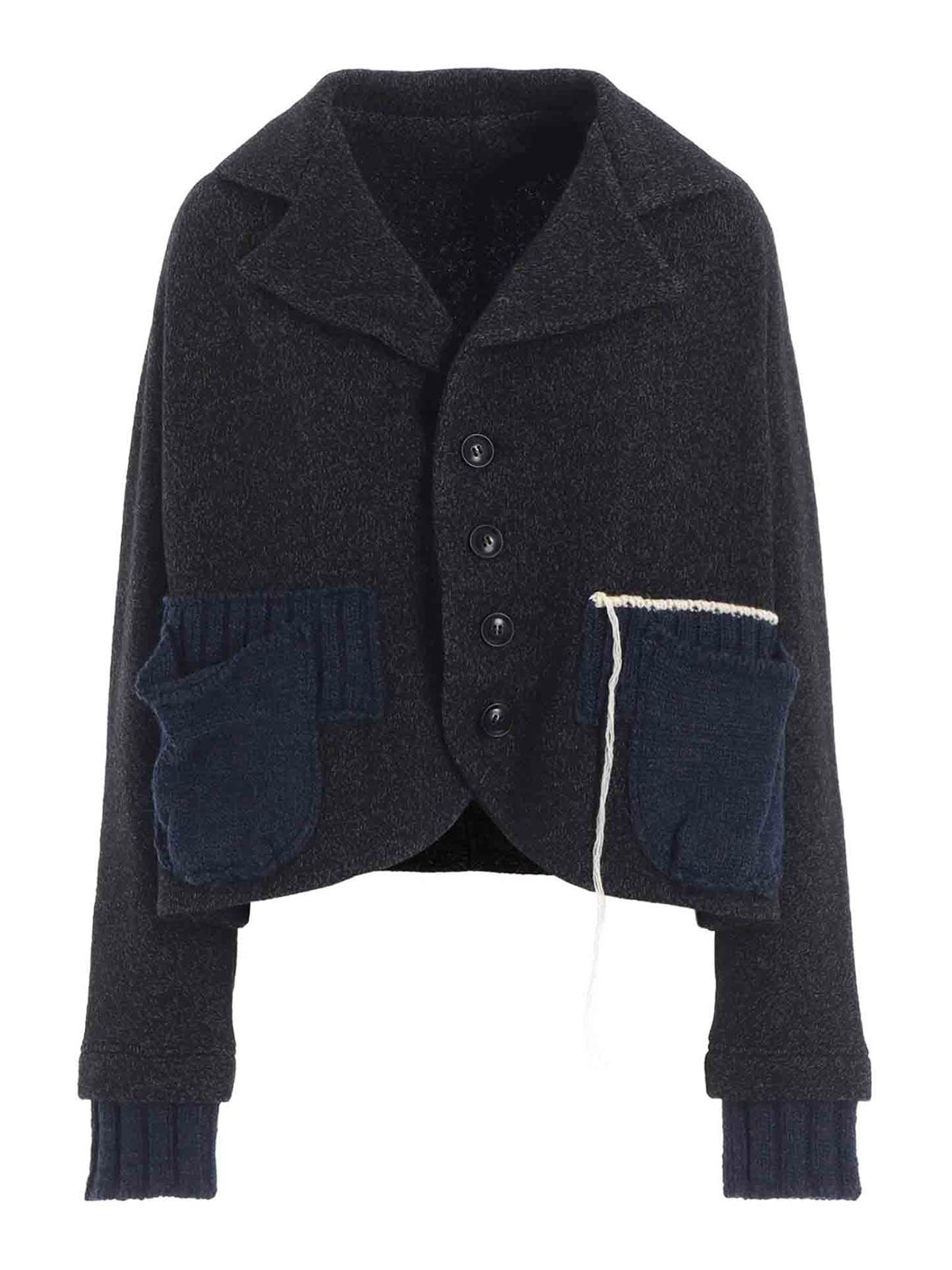 Black wool blend jacket, button fastening, lapel collar, knitted patch pockets, ribbed knit polo shirt.