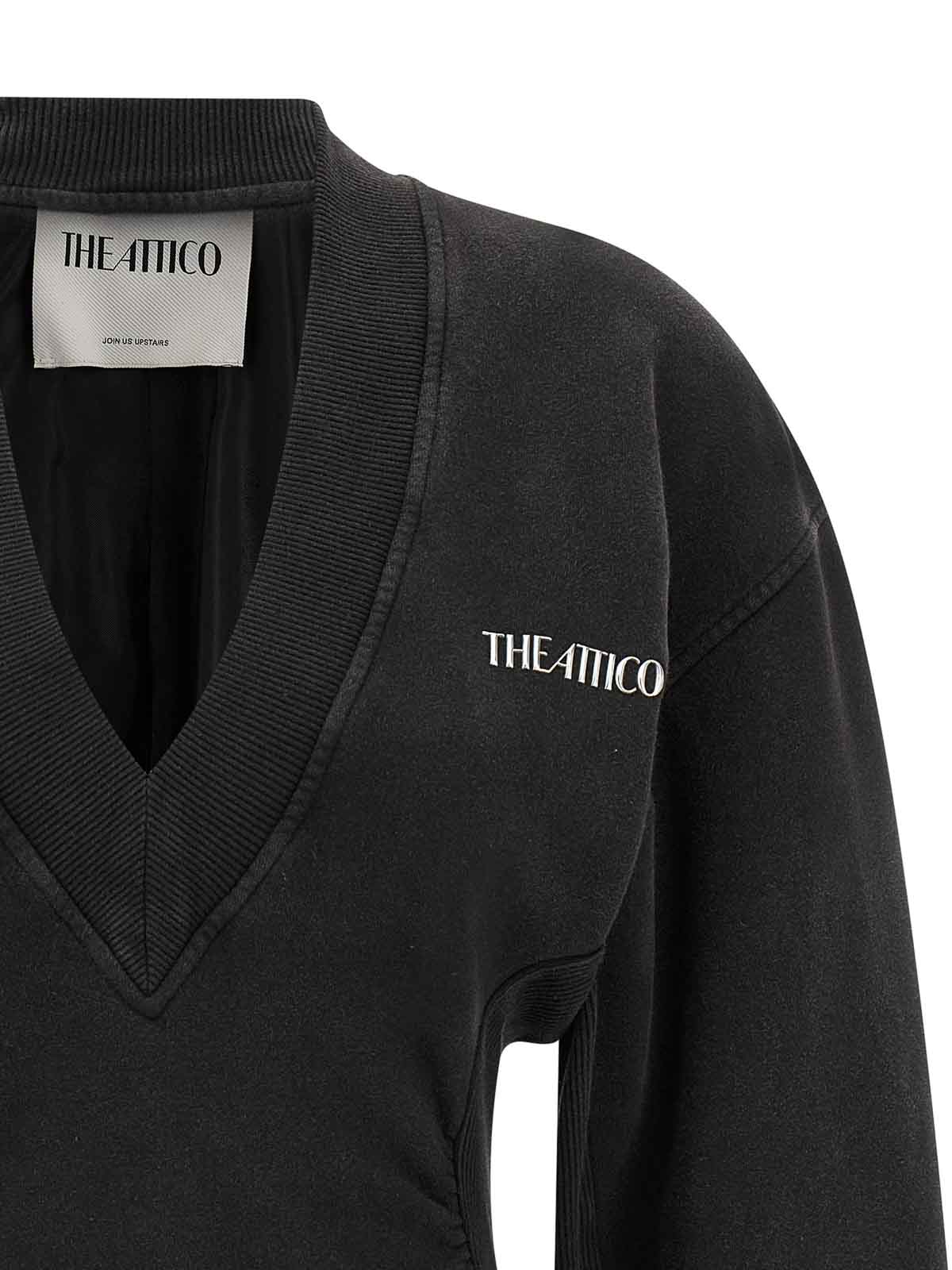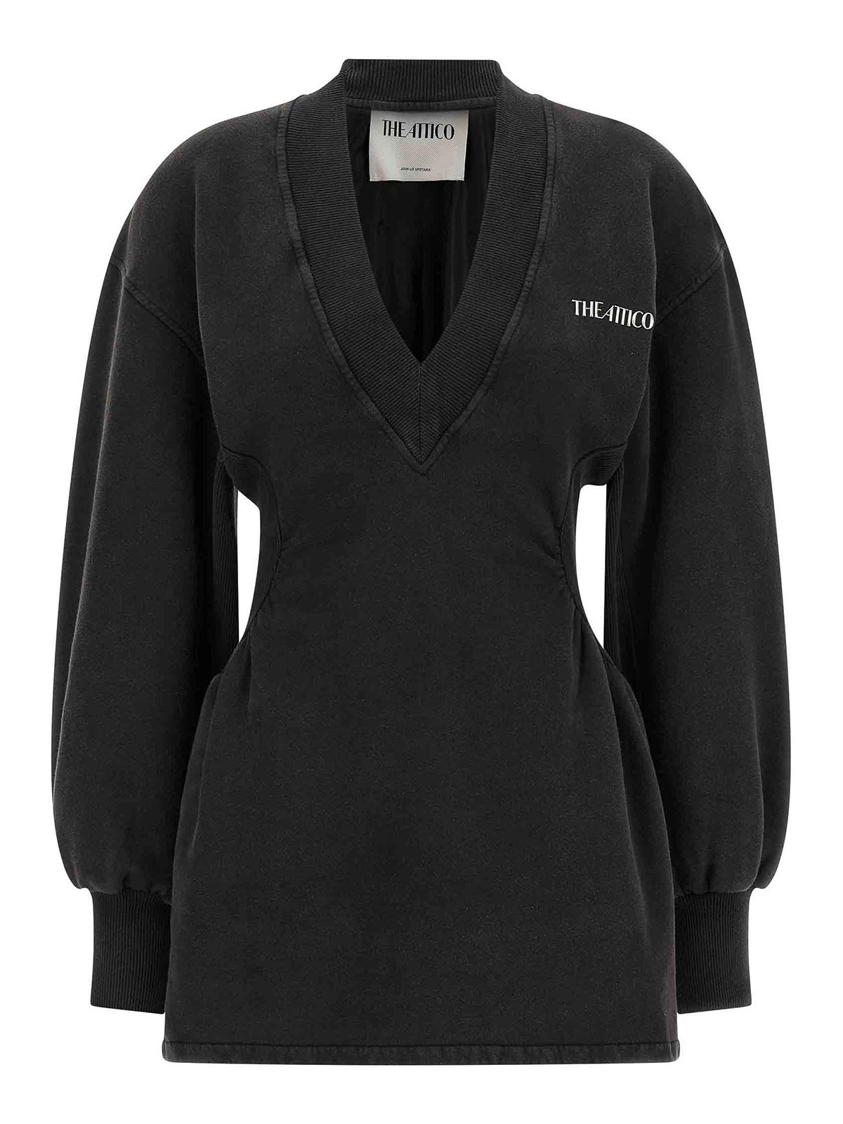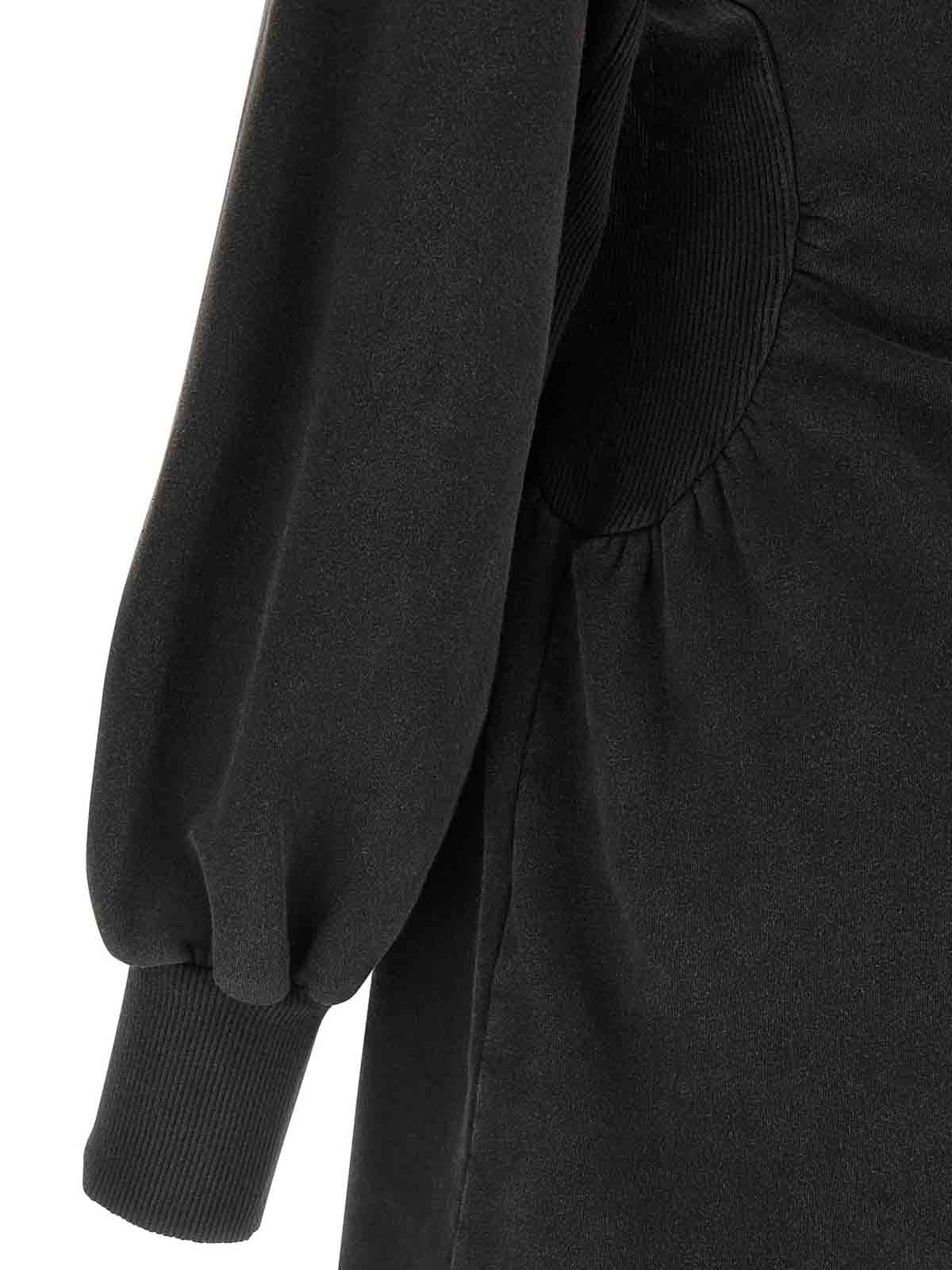 Fleece mini dress, v-neck, front embossed logo embroidery, long cuffed sleeves, ribbed stretch cotton side inserts.