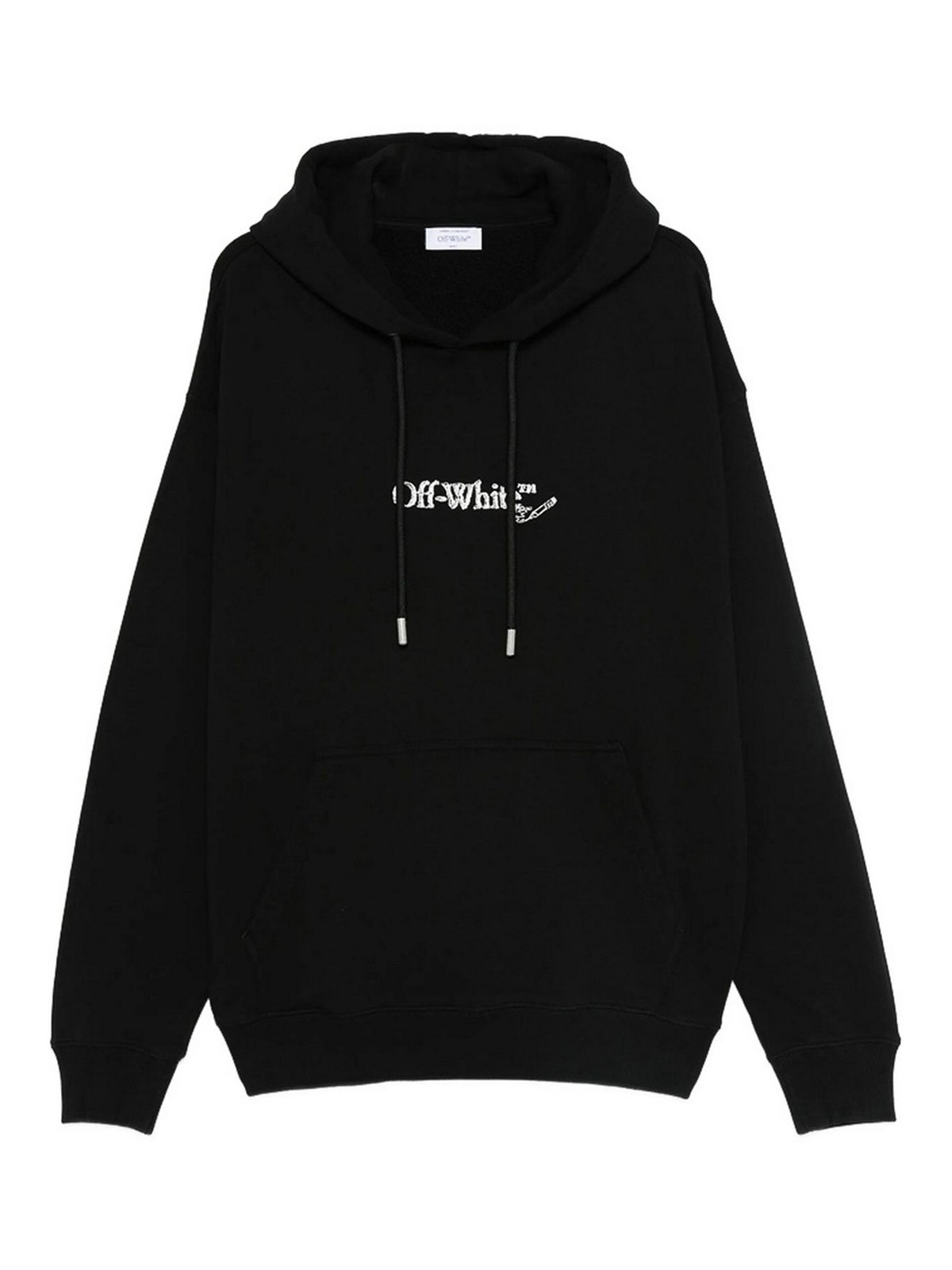Black drawstring hood kangaroo pocket embroidered logo long sleeves ribbed cuffs