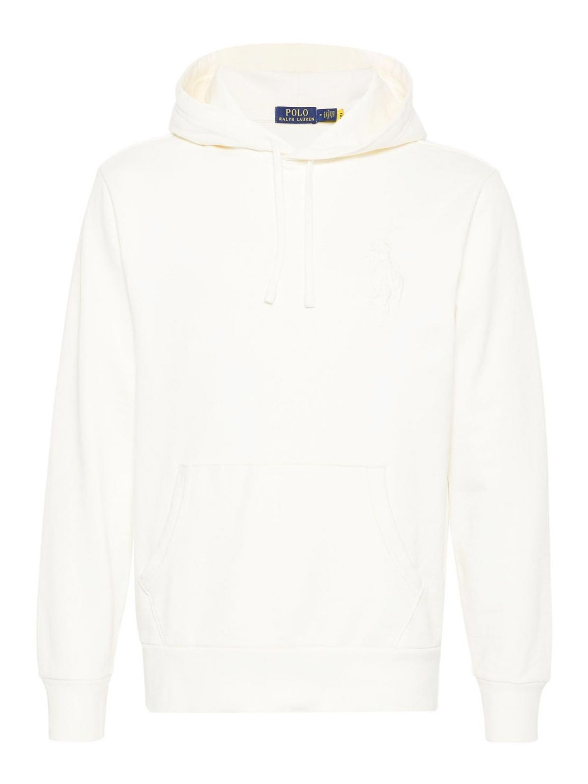 Cream white texture signature polo pony motif embroidered logo at the chest drawstring hood long sleeves pouch pocket ribbed cuffs and hem