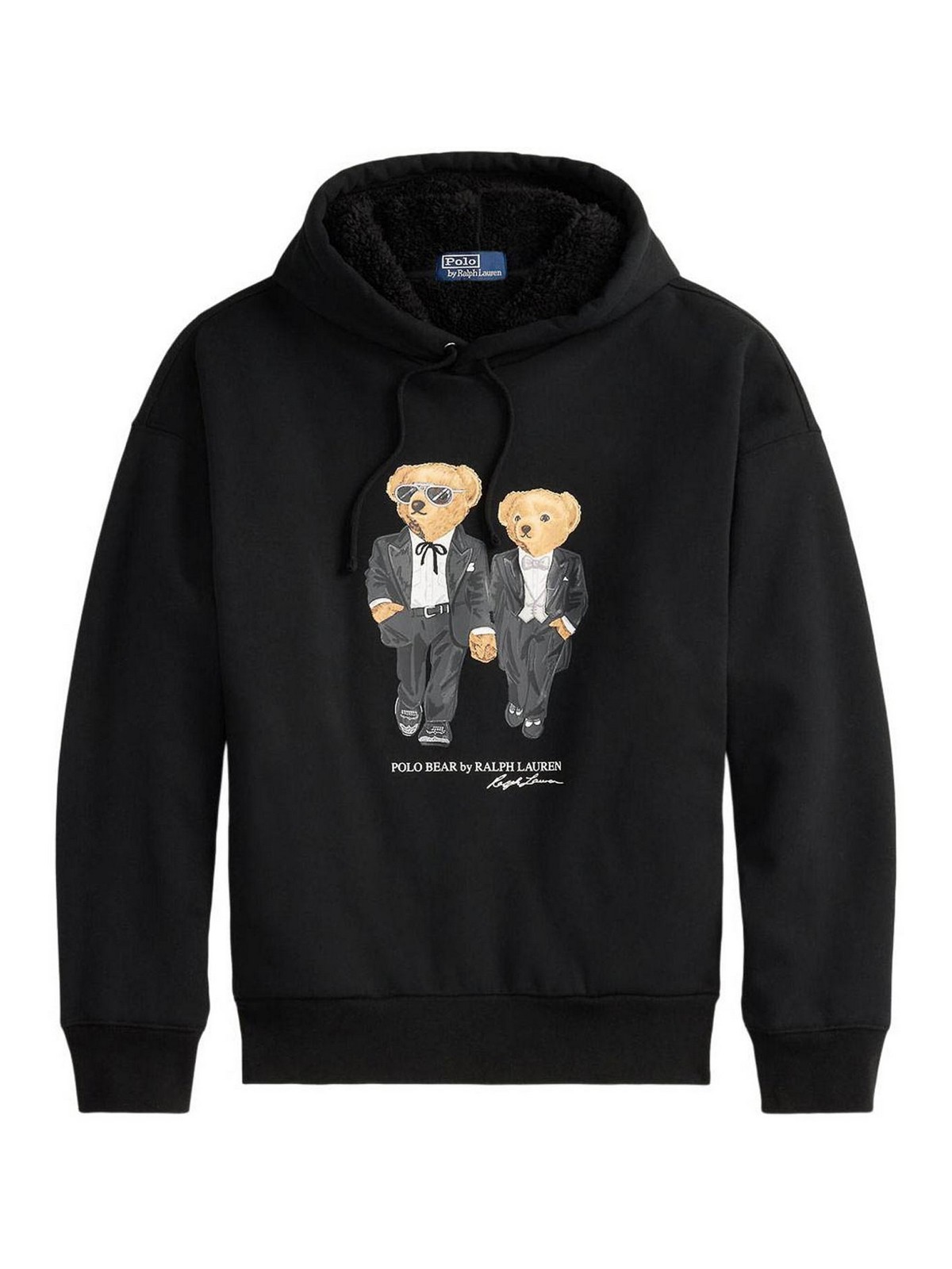 Black high-pile fleece two bear graphic long sleeves drawstring hood kangaroo pocket