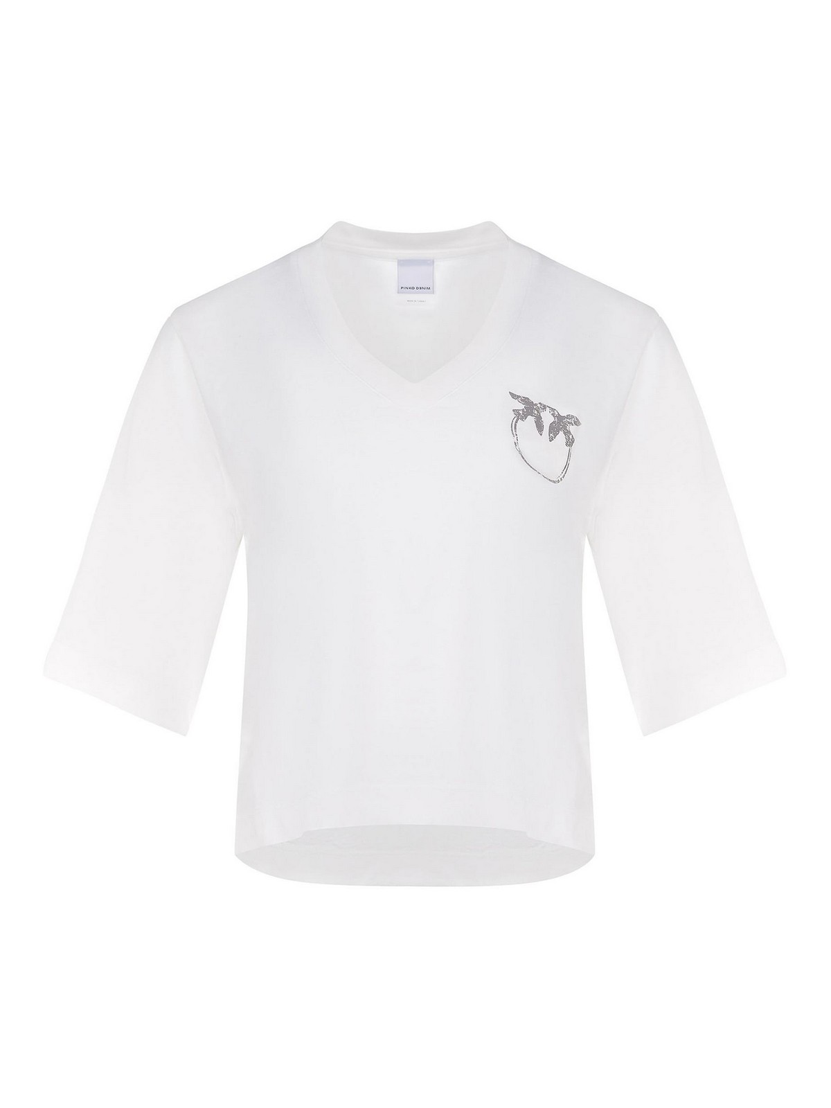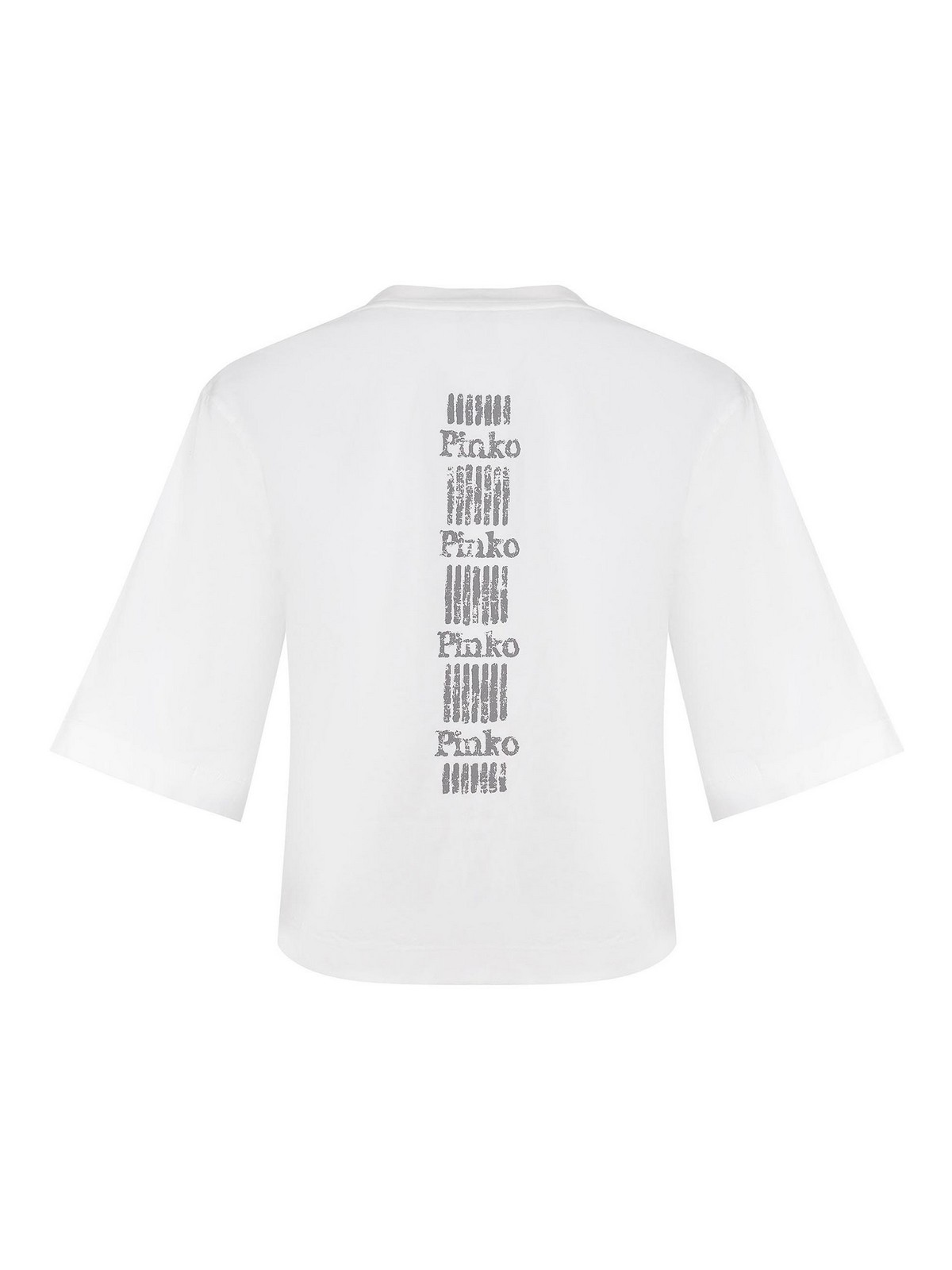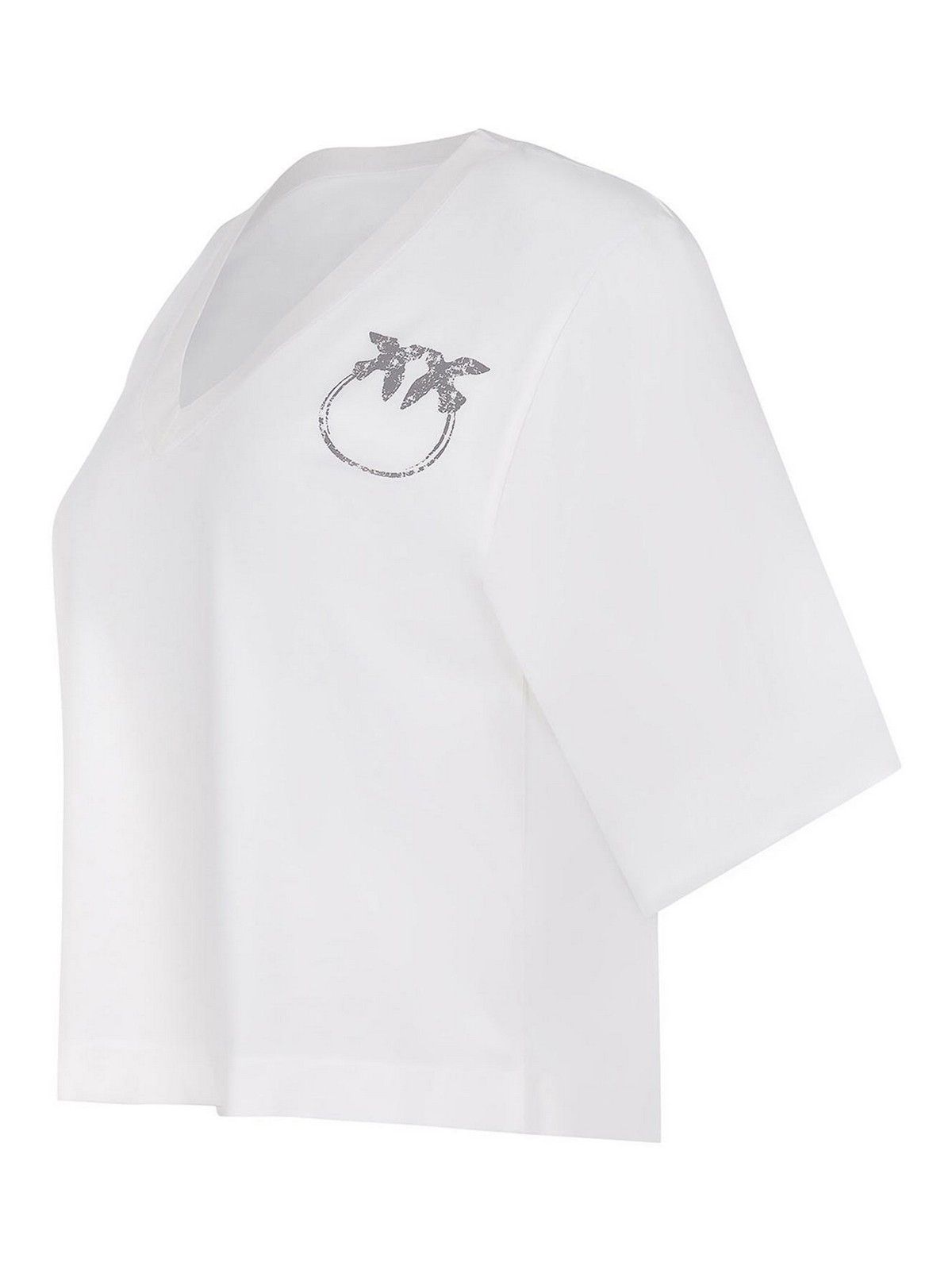 Pinko suez t-shirt made of white cotton. ribbed v-neck. short mnaiche. contrasting printed love birds logo on the chest. logo lettering printed on the back. crop top. 100% cotton