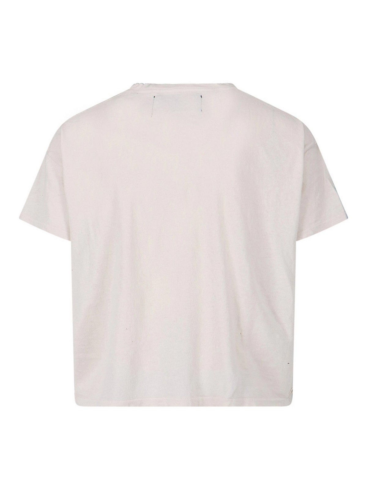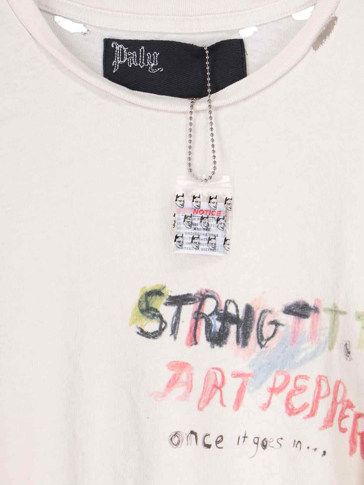 straight time play T-shirt in white cotton, crew neck, short sleeves, all-over destroyed details, contrasting print on the front, logo tag on the front, straight hem.