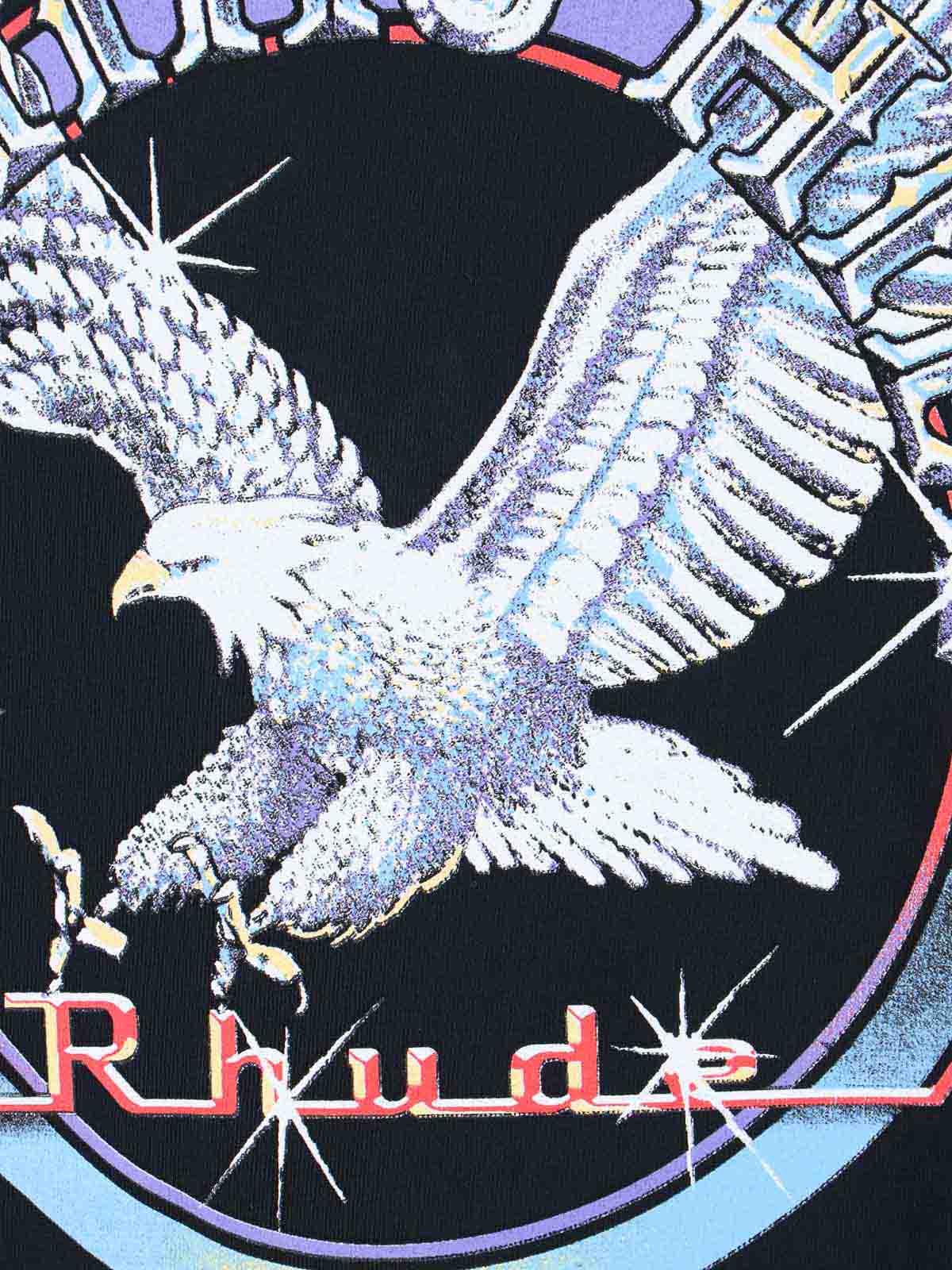 notting hill eagle rhude t-shirt, in black cotton, short sleeves, crew neck, maxi multicolor print on the front, straight hem.