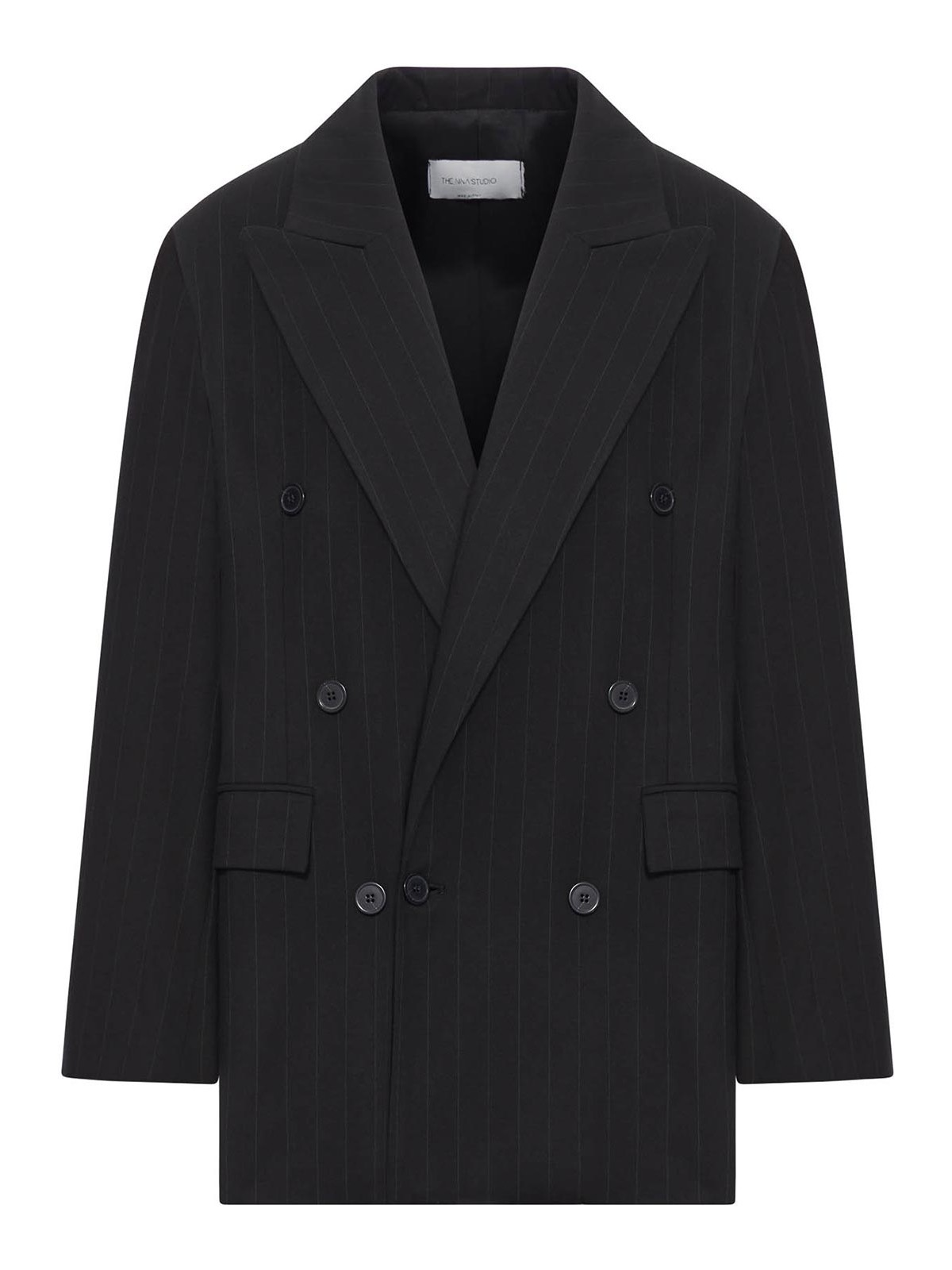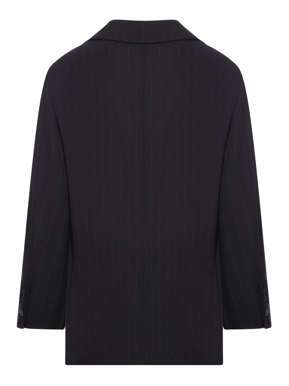 Classic peak lapels- structured shoulders- front closure with tone-on-tone buttons- pinstripe effect- two front flap pockets- long sleeves- cuffs with decorative buttons- lined- color black