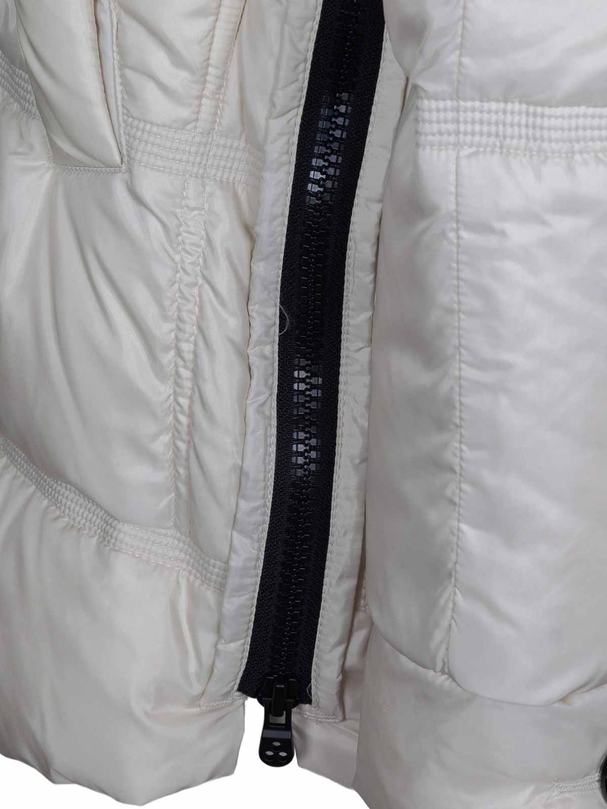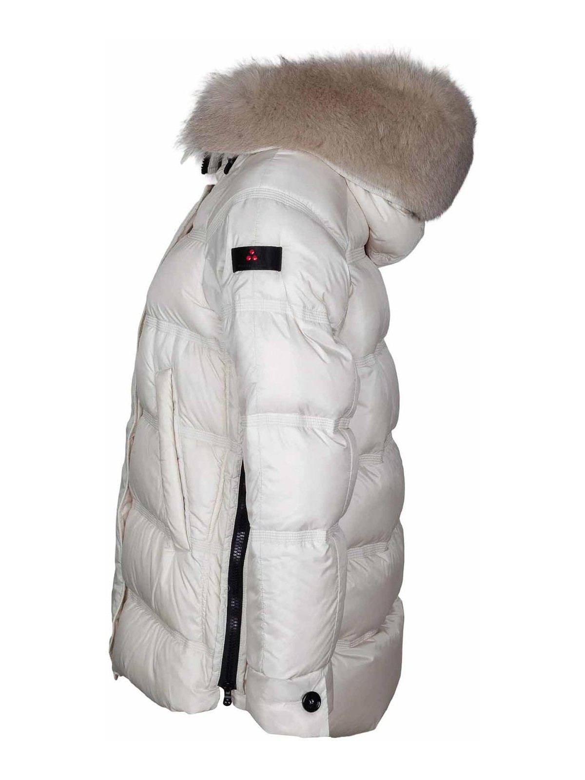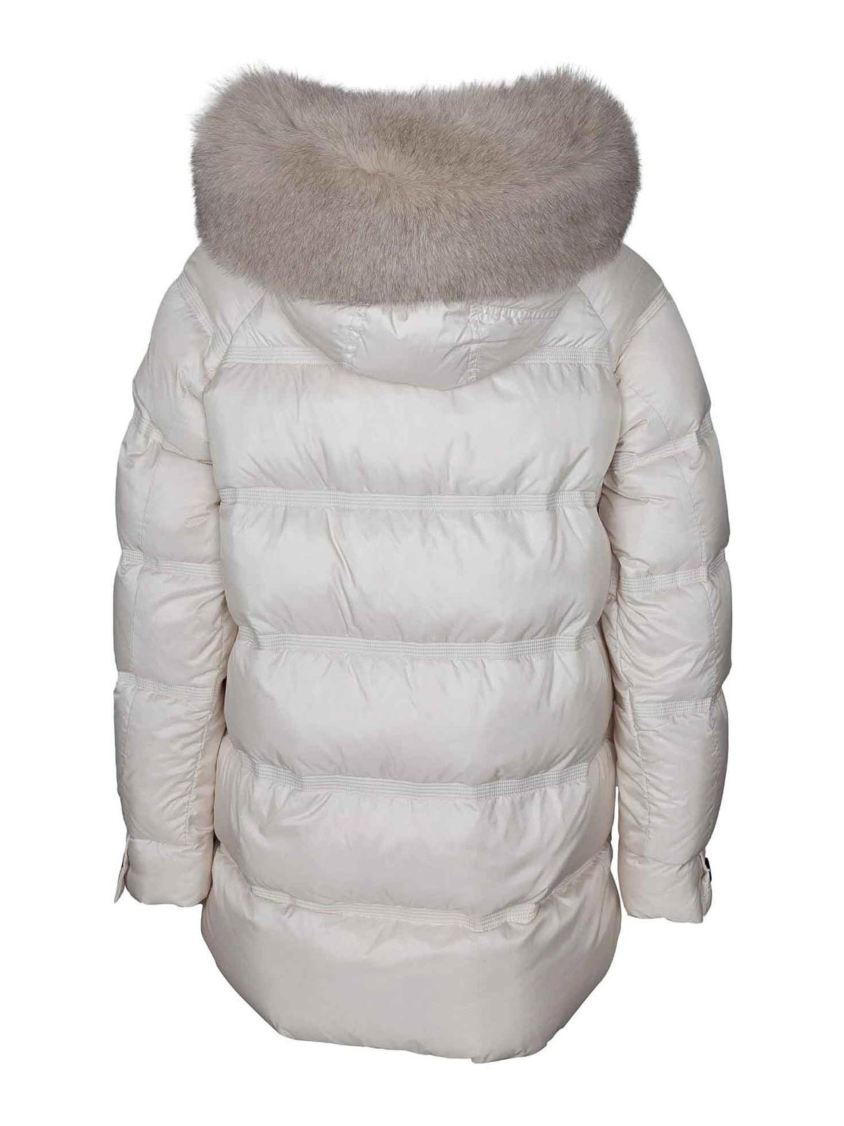 Quilted jacket with large, super light quilts. The certified goose down padding ensures high warmth and lightness. Fixed hood enriched by a detachable fox fur trim.
