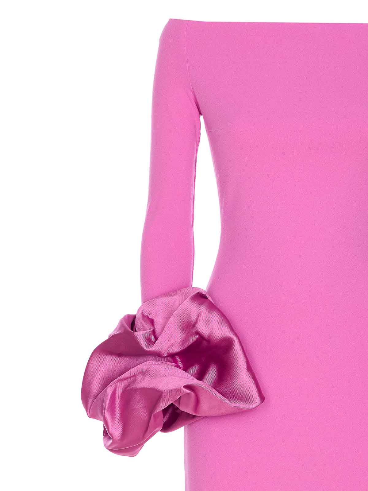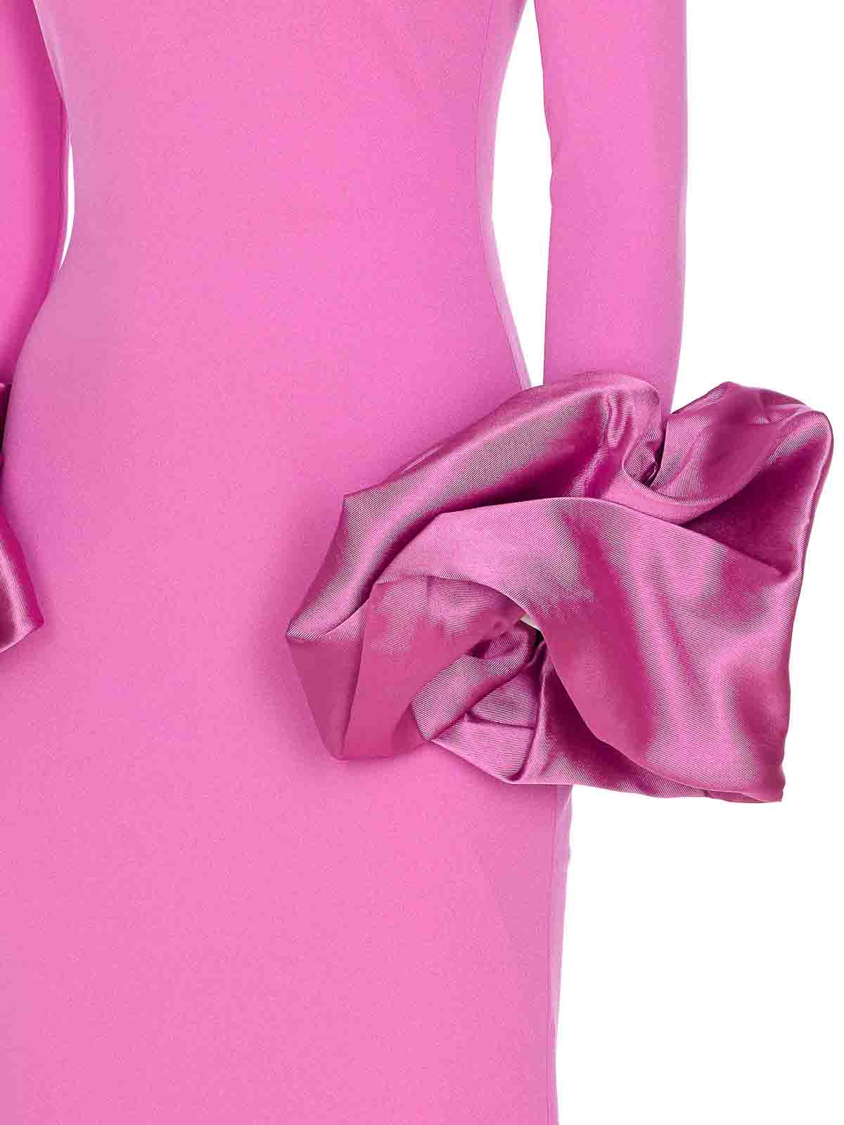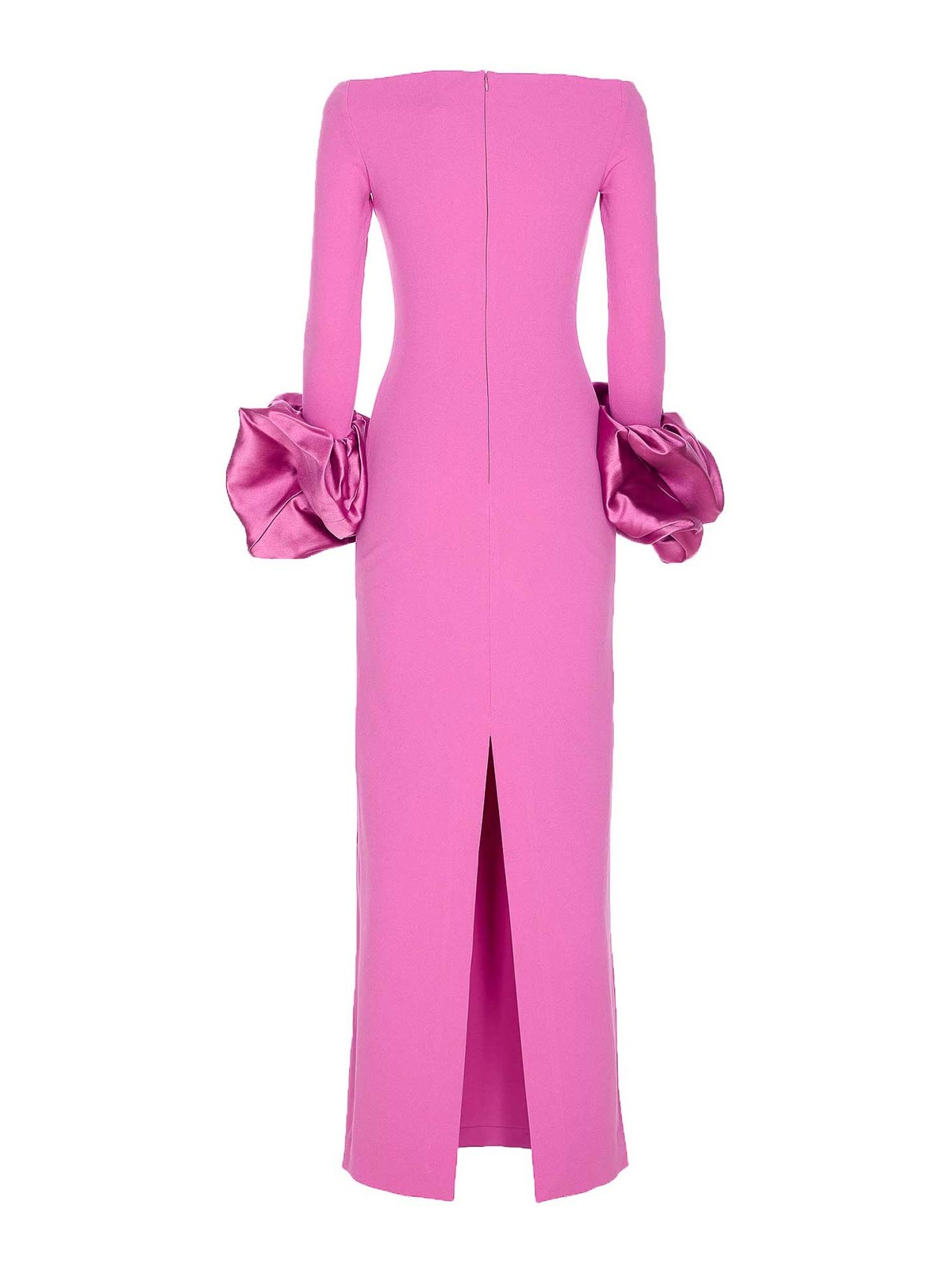 Solace london purple talia maxi dress, zip closure on the back, boat neckline, long slevees, maxi roses detail on cuffs, long model, split at bottom on the back
