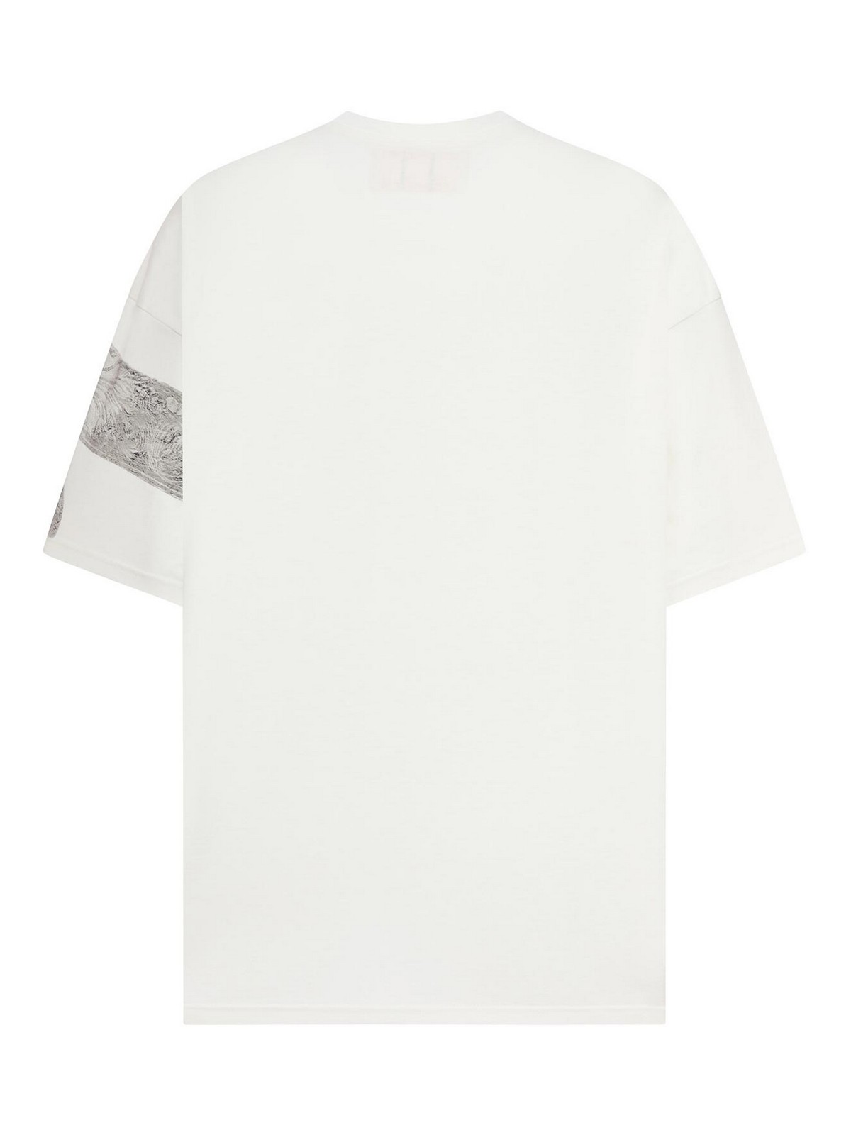 Crew neck- short sleeves- oversized- embossed screen print on and back- color white