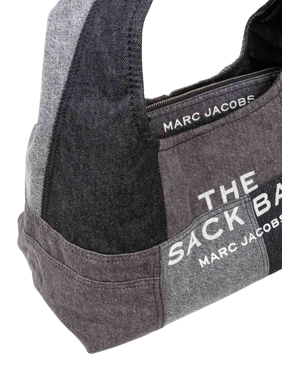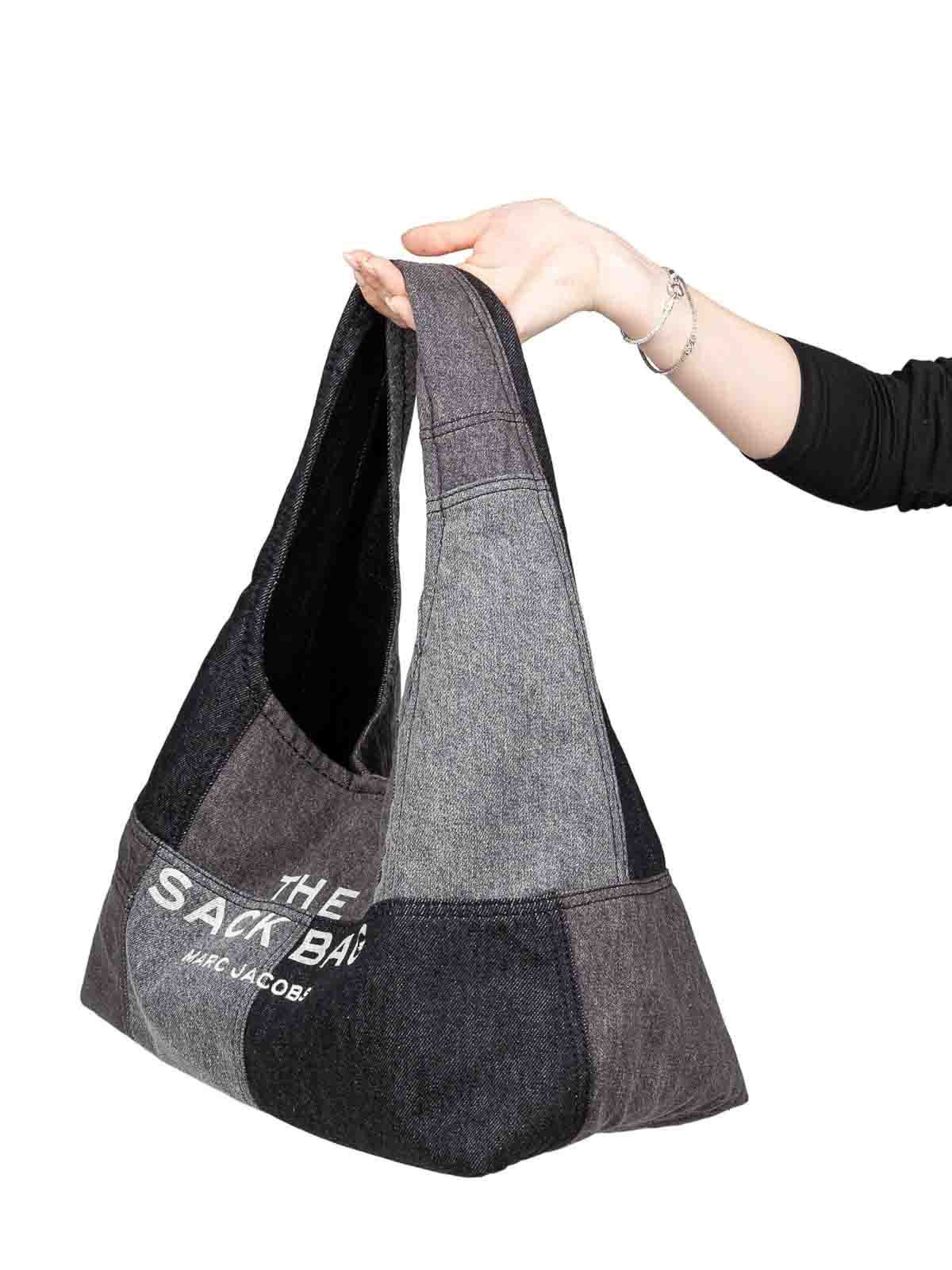 Shopping bag in soft black patchwork denim, magnetic closure, one internal zip pocket, one internal removable clutch bag, front logo