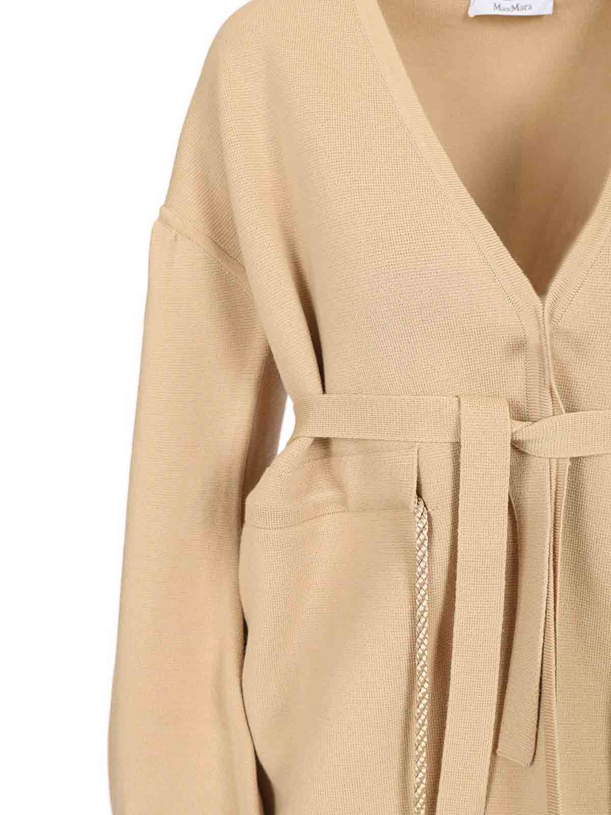 tibero cardigan with drawstring from max mara, made of cloth-stitched virgin wool, with v-neck, dropped shoulder and wide long sleeves. open front with drawstring and belt.