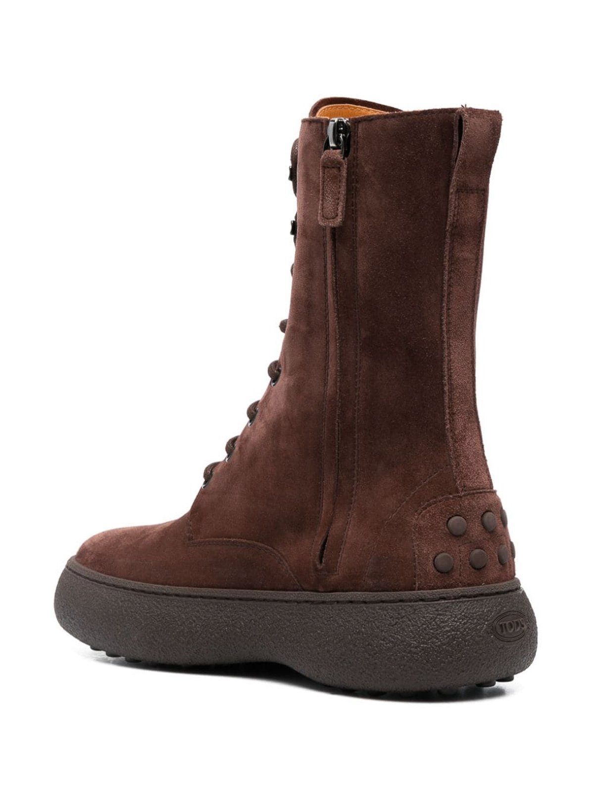 Wg suede lace-up ankle boots by Tod's featuring brown calf leather paneled design in calf suede logo print on front tonal stitching logo pull tab on heel rounded toe front lace-up ankle fastening and chunky