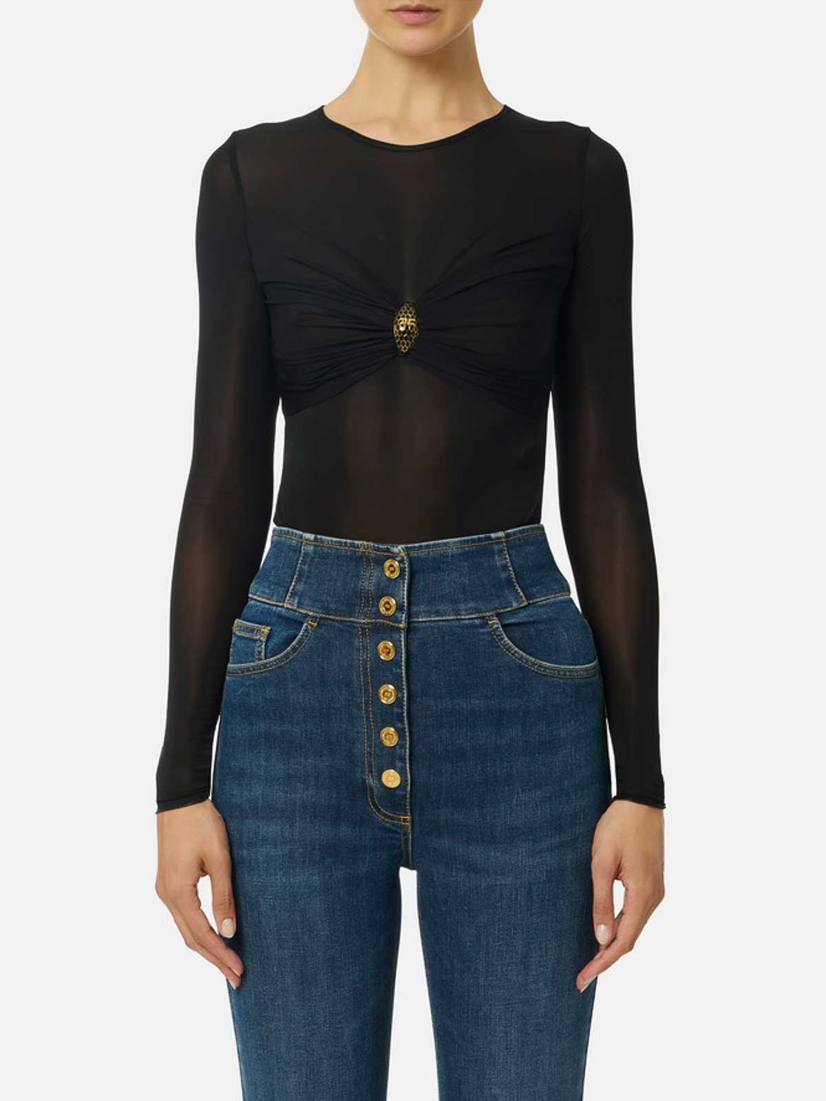 Elisabetta franchi jersey bodysuit with jewel detail, tight fit, crew neck and long sleeves with central drape held in place by the enamel jewel plaque, embellished with the snake-inspired pattern.