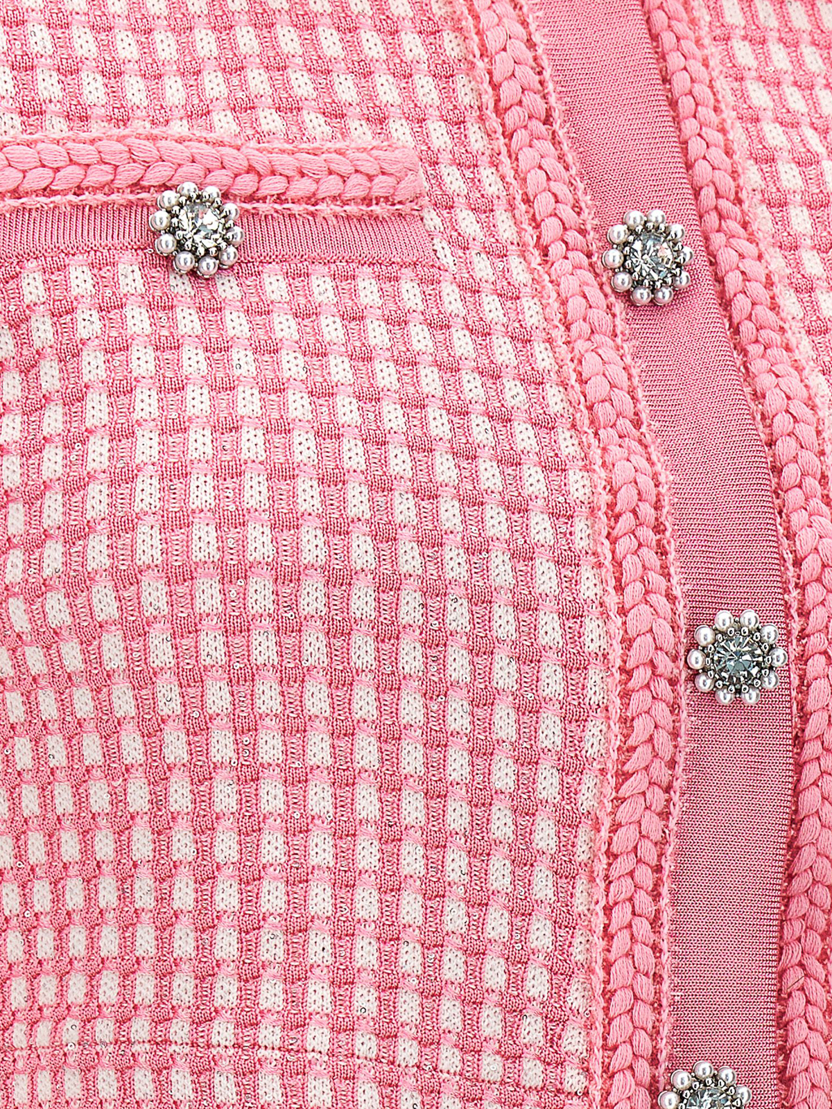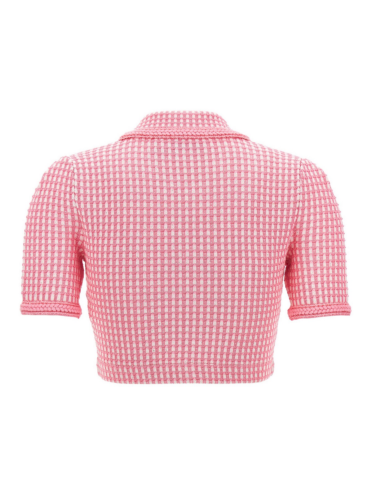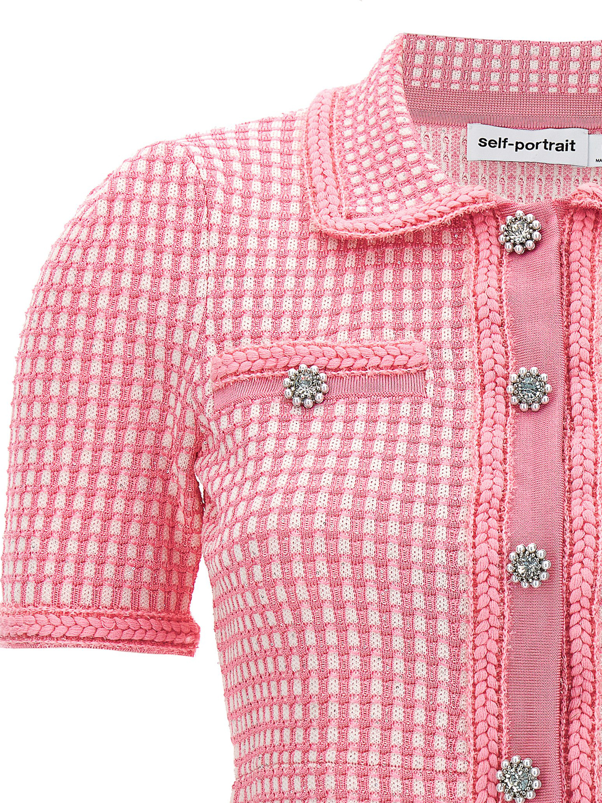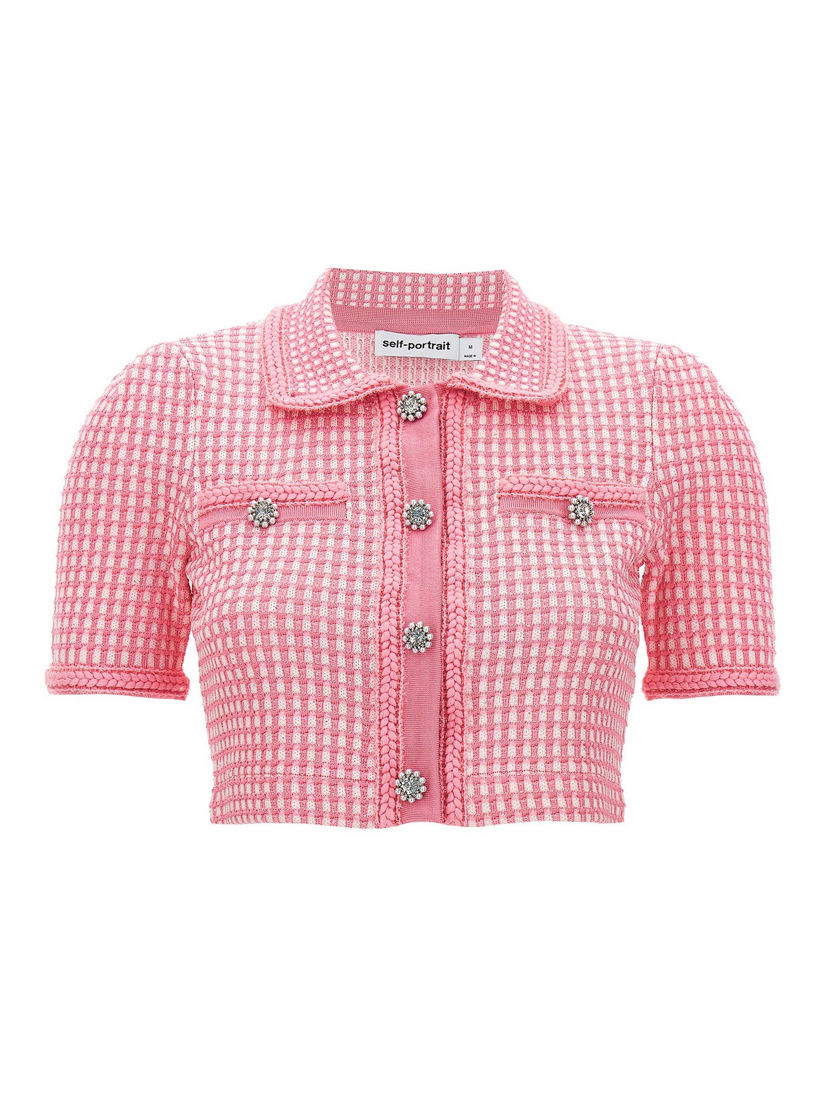 Lurex knitted' knitted top with lurex thread front button closure collar short sleeves pockets and jewel button appliqu