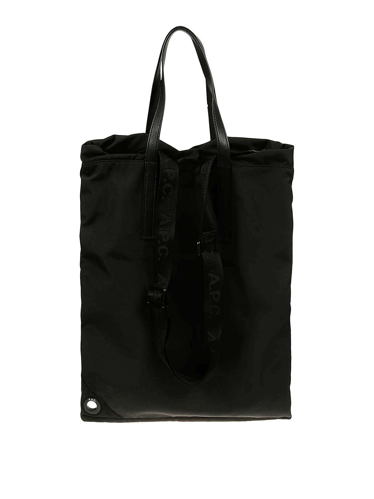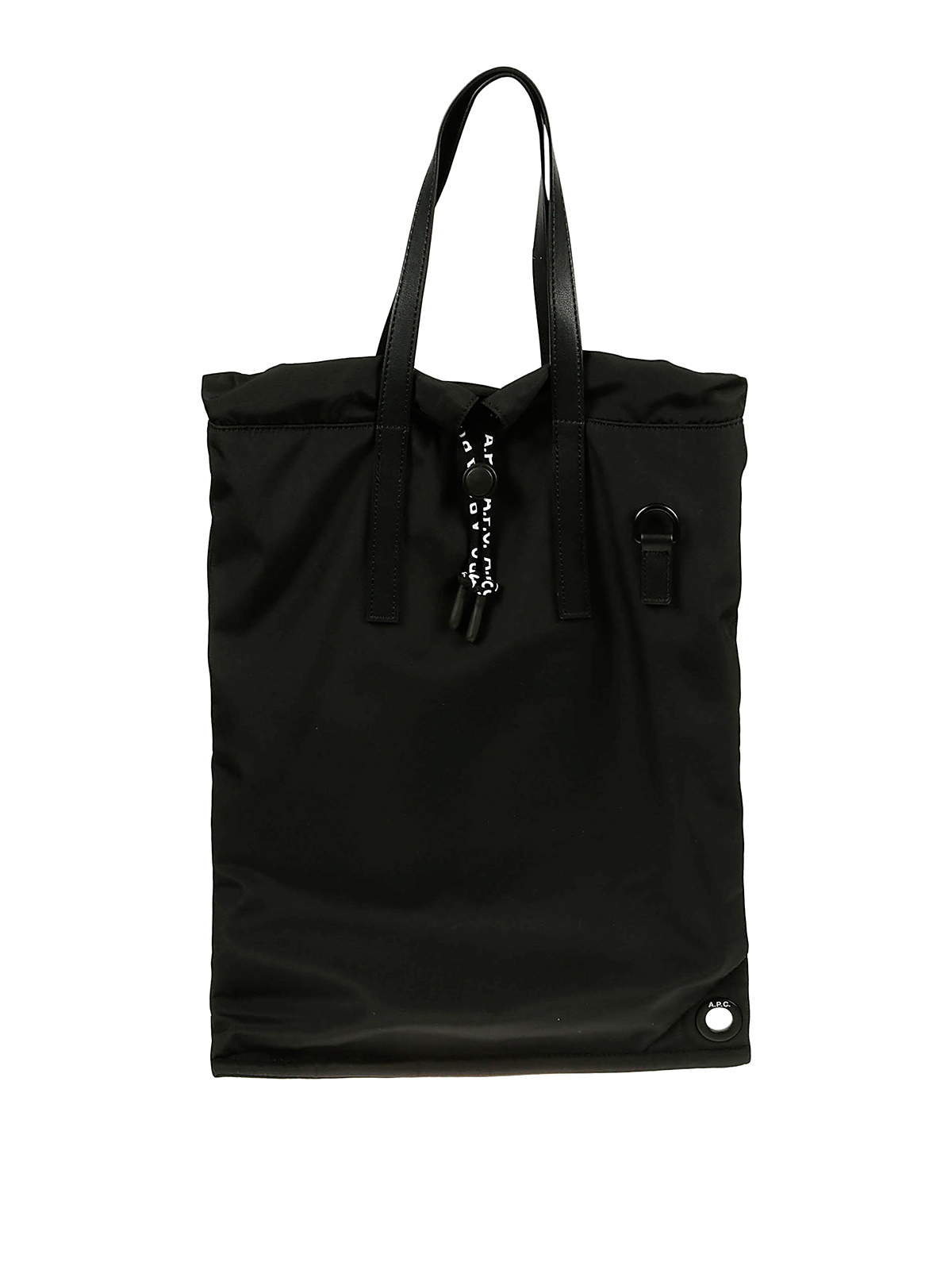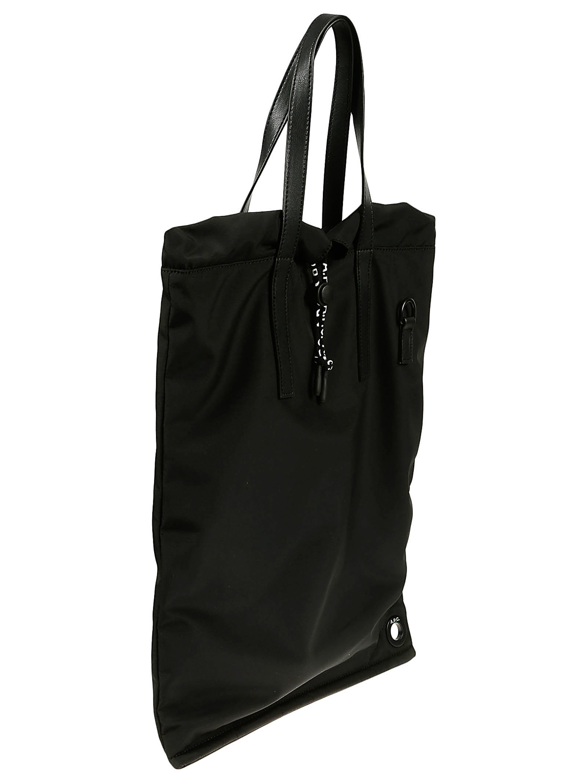 A p c black shopping bag drawstring closure shoulder strap logo detail