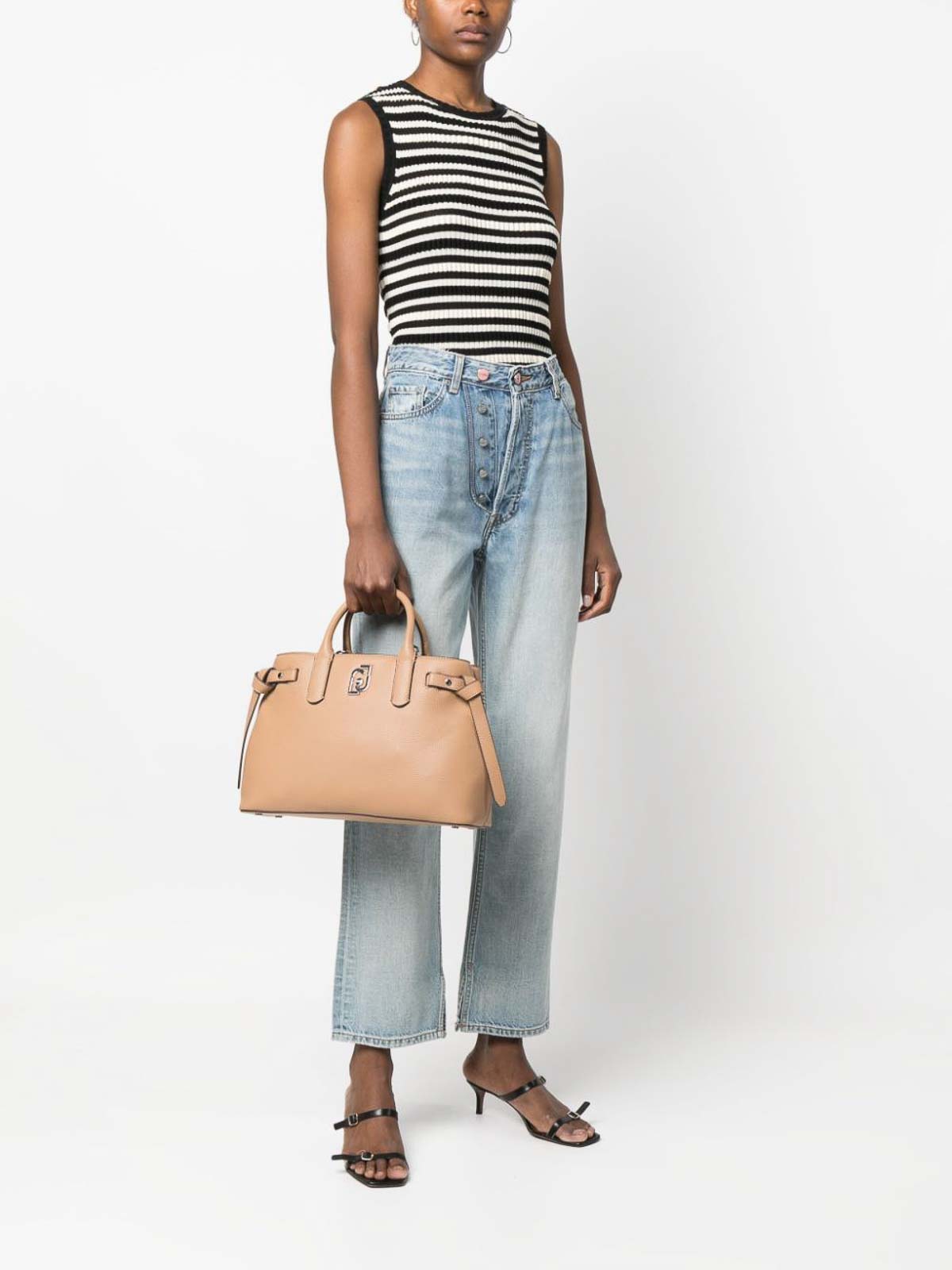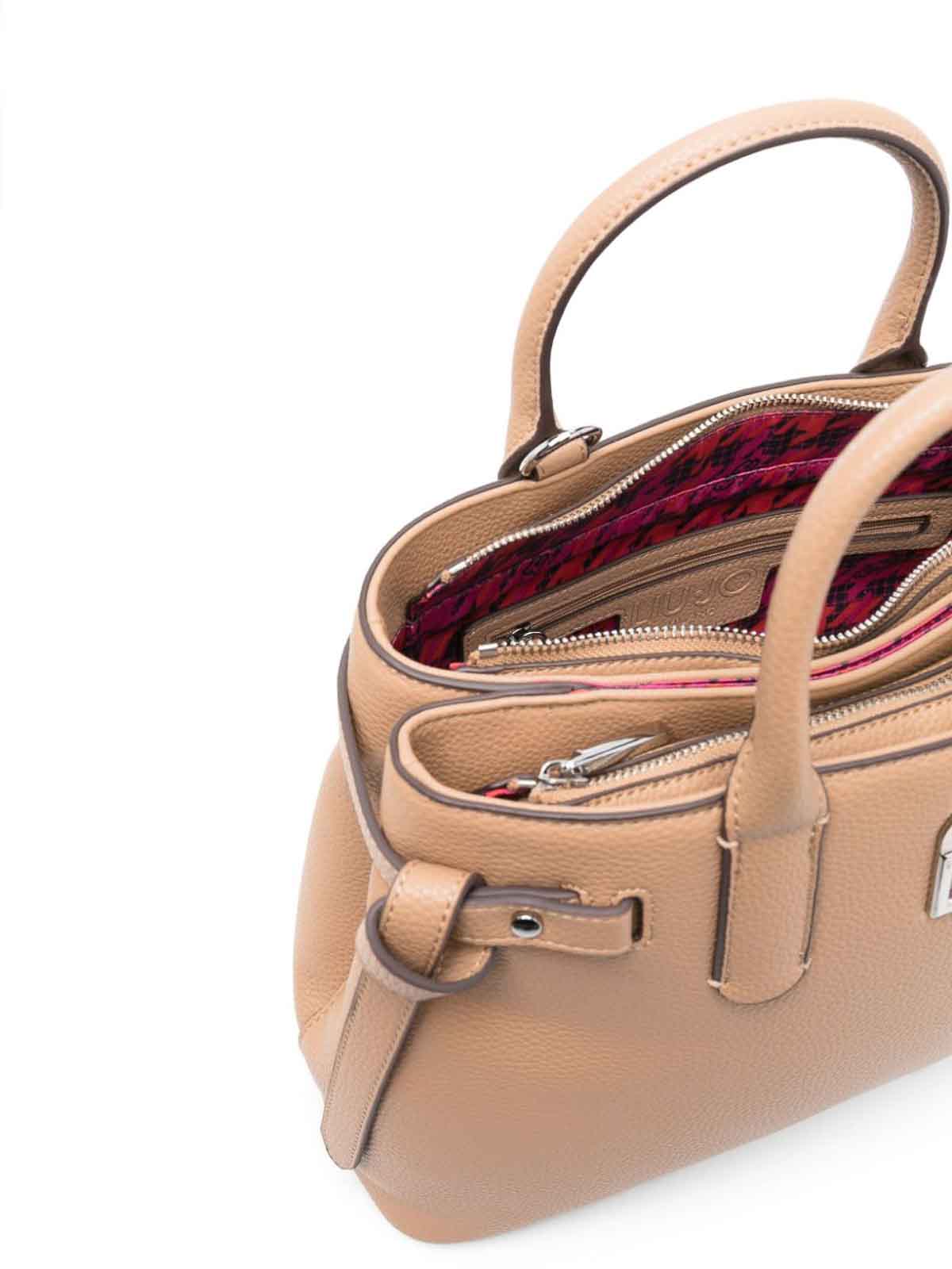 Camel brown eco-friendly logo-plaque tote bag from liu jo featuring faux leather pebbled texture silver-tone logo plaque silver-tone hardware circular top handles adjustable detachable shoulder strap top zip fastening partitioned compartment internal logo patch and internal zip-fastening pockets