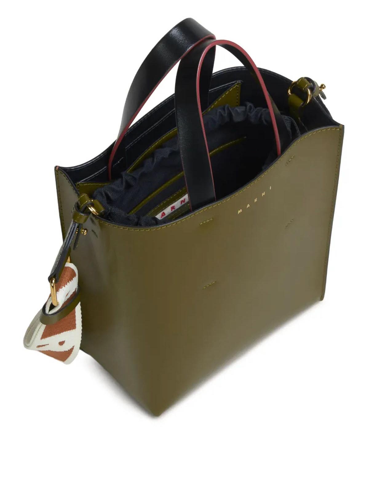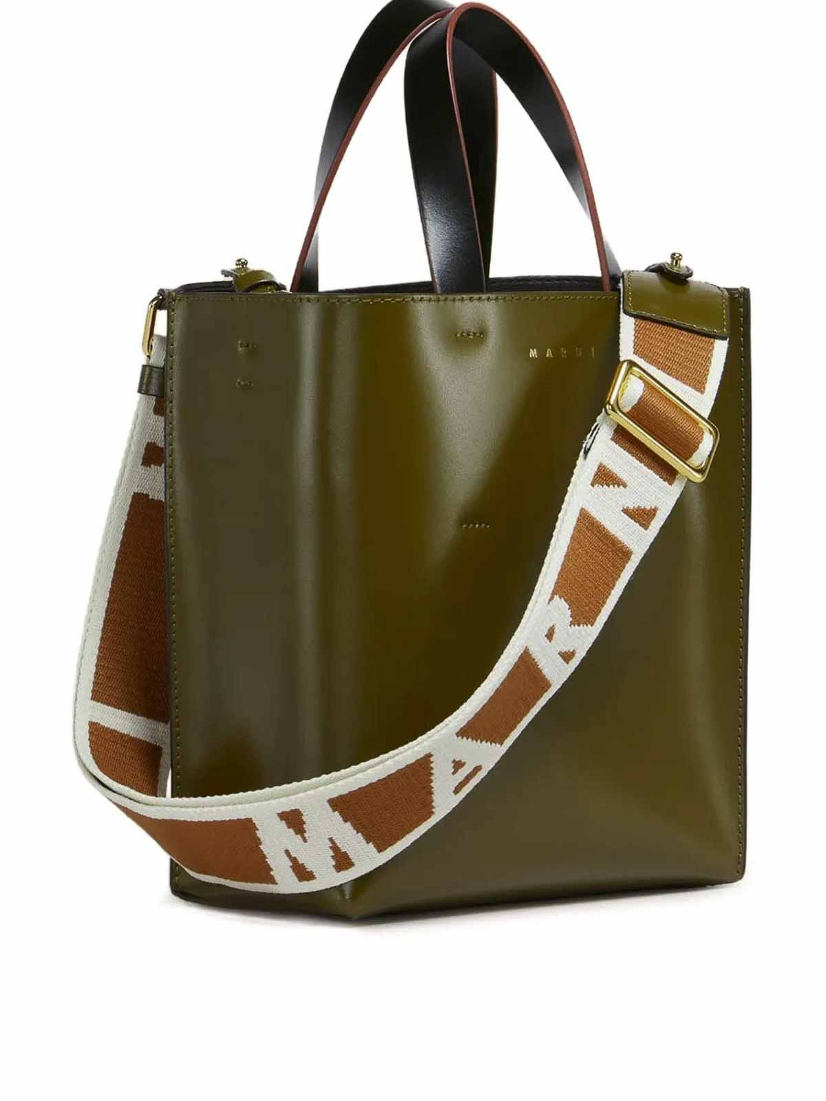 Smooth calfskin, interior open pocket with embroidered logo, top leather handles, adjustable and removable recycled ribbon shoulder strap with marni lettering, gold-tone hardware, and gold-tone logo print on the front. composition lining: 55% cotton, 45% polyurethane exterior: 100% calfskin made in italy