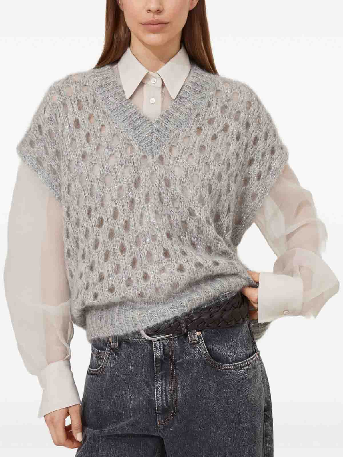 Light gray neckline V to open stitch without sleeves with ribbed edge