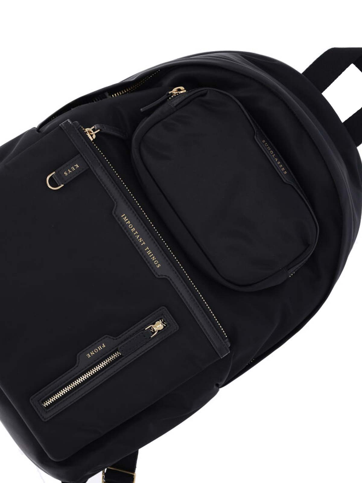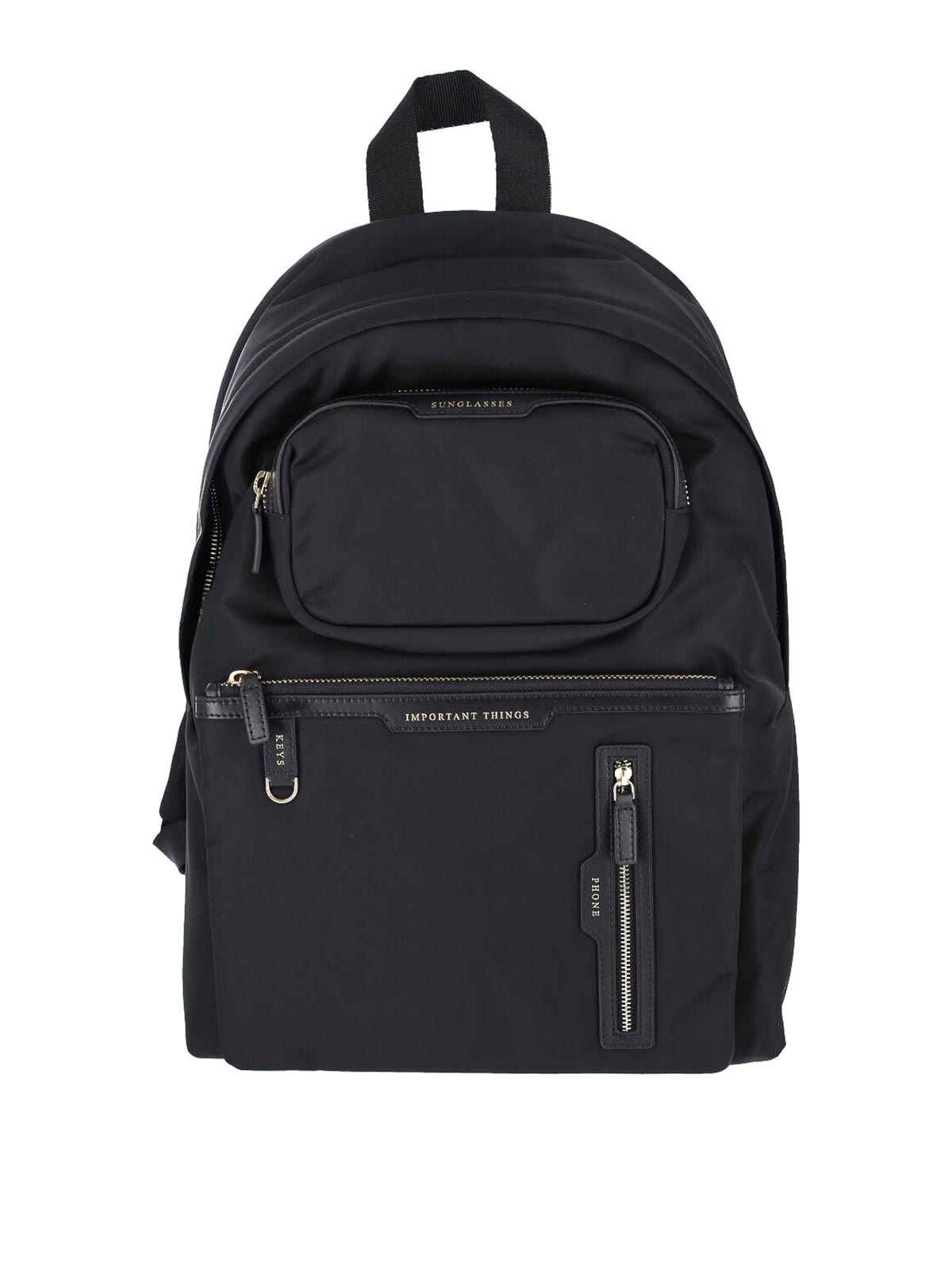 Anya Hindmarch luxury travel backpack, in black nylon, leather finishes, handle, two adjustable shoulder straps on the back, zip closure, one front zip pocket, one maxi front zip pocket, one patch zip pocket detail, two side flat pockets, one single internal compartment.