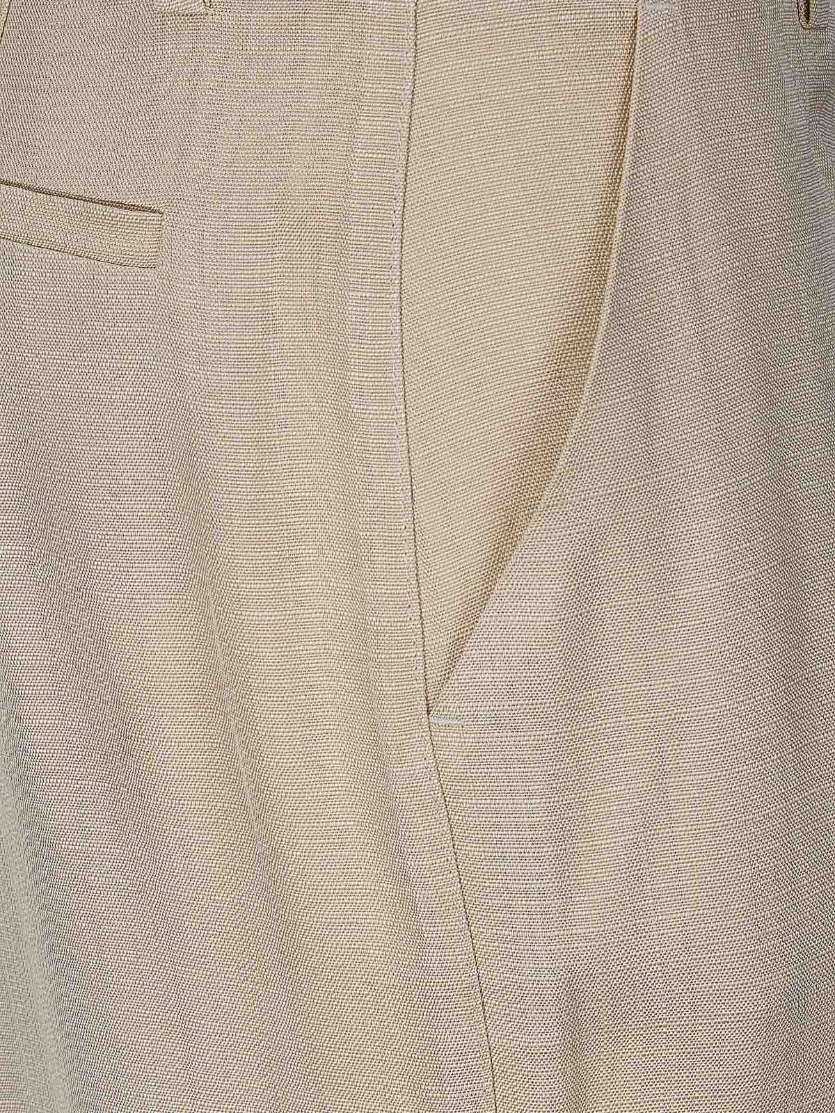 Linen effect trousers, straight leg with pleats, button and zip closure, side pockets.