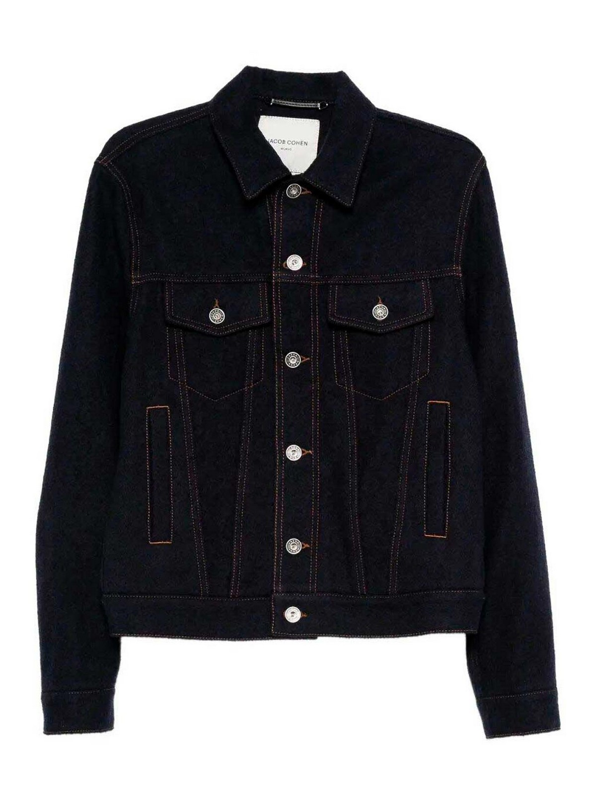 Trucker jacket, navy blue yarn-dyed pure wool cloth, rounded brown suede label and embossed logo, fixed tack button with 3D logo, old silver metallic finish, front pockets and flap pockets