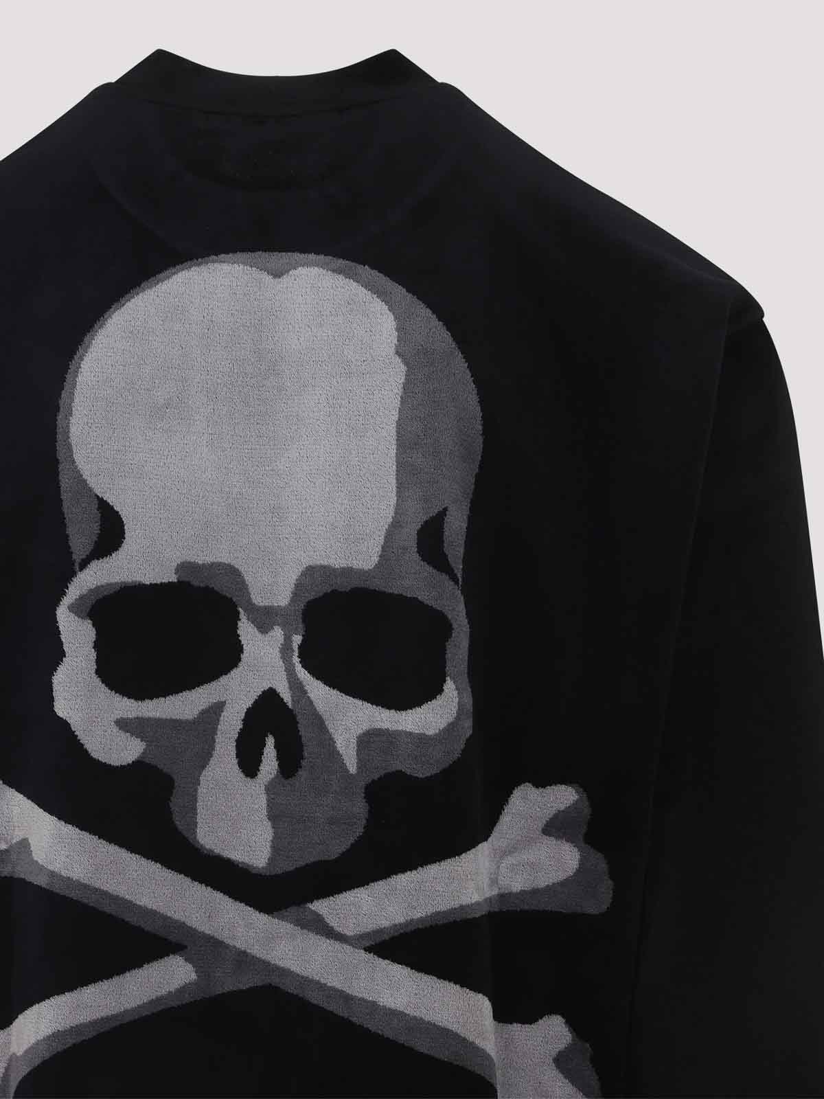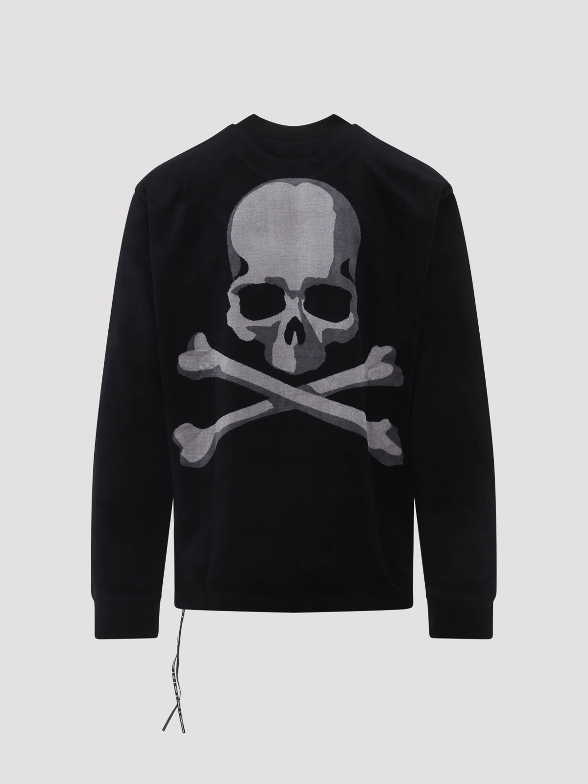 Mastermind japan black velour long sleeves tee crafted and blend round neck contrasting grey lettering logo back contrasting grey skull design long sleeves ribbed cuffs side tonal strap straight hem