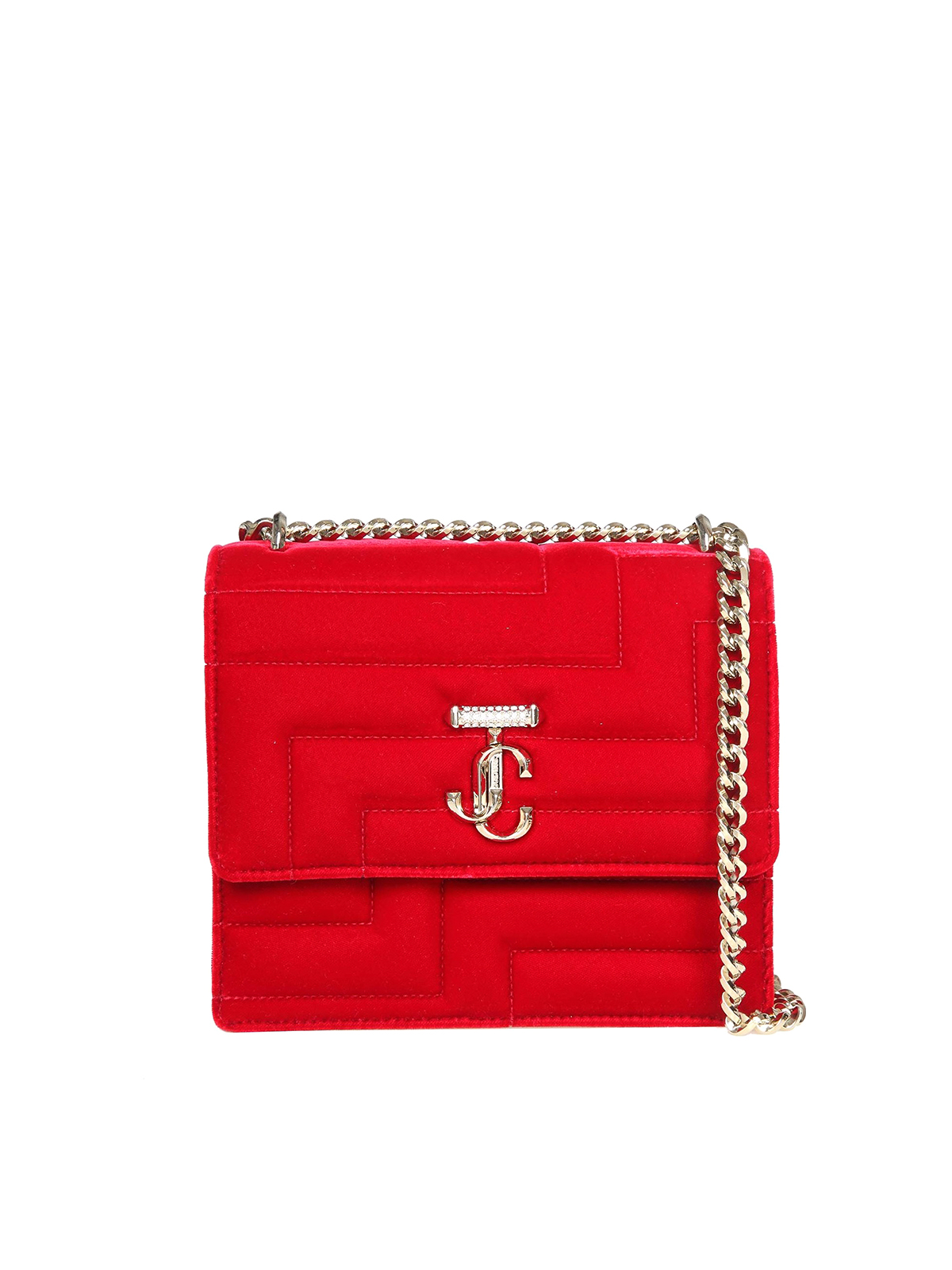 Shoulder bag in red matelassé velvet magnetic closure non-adjustable shoulder strap with chain and leather strap raised jc bar applied crystals internal slit pocket external back pocket