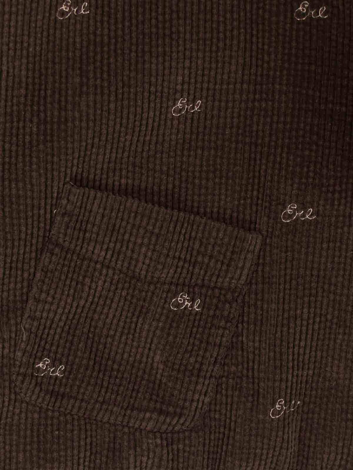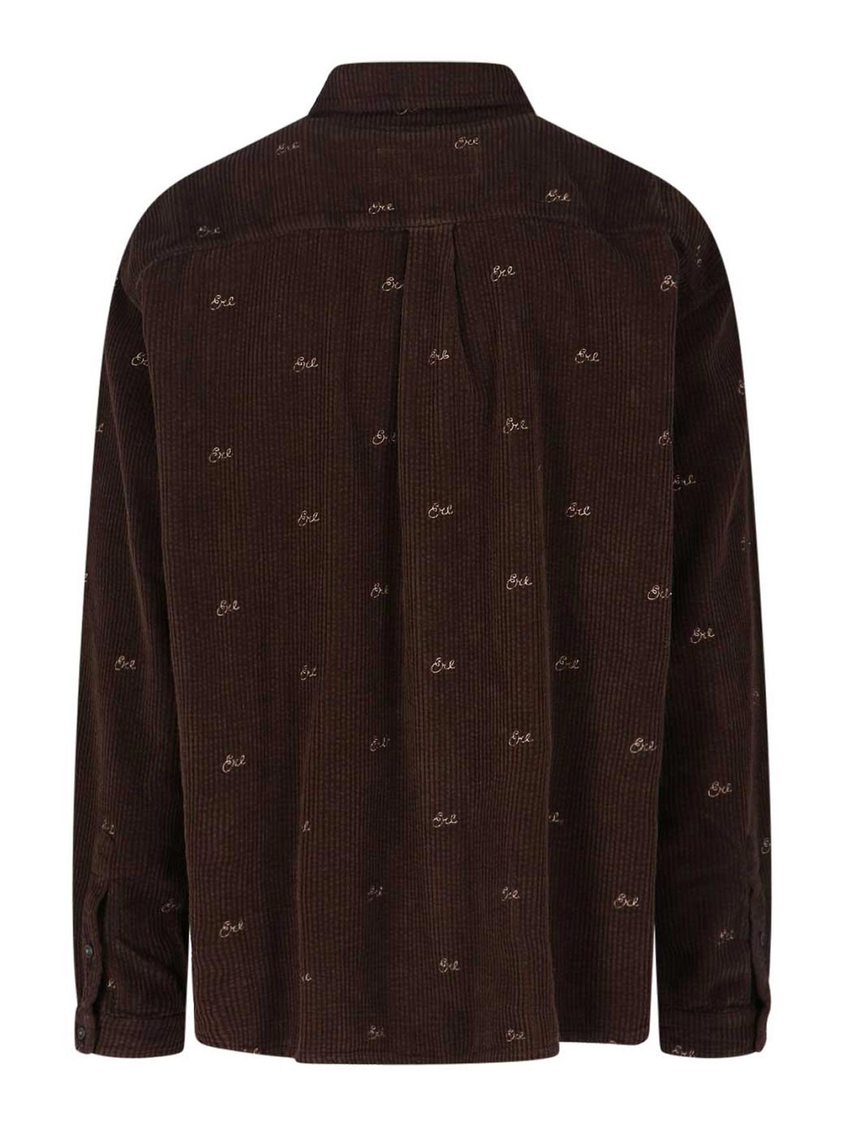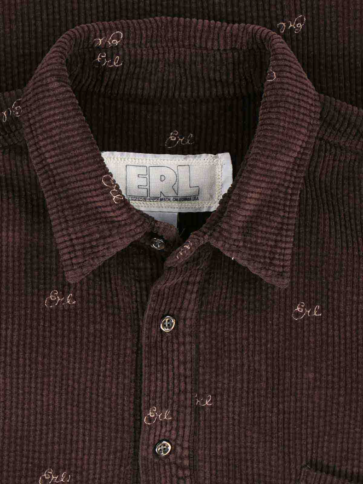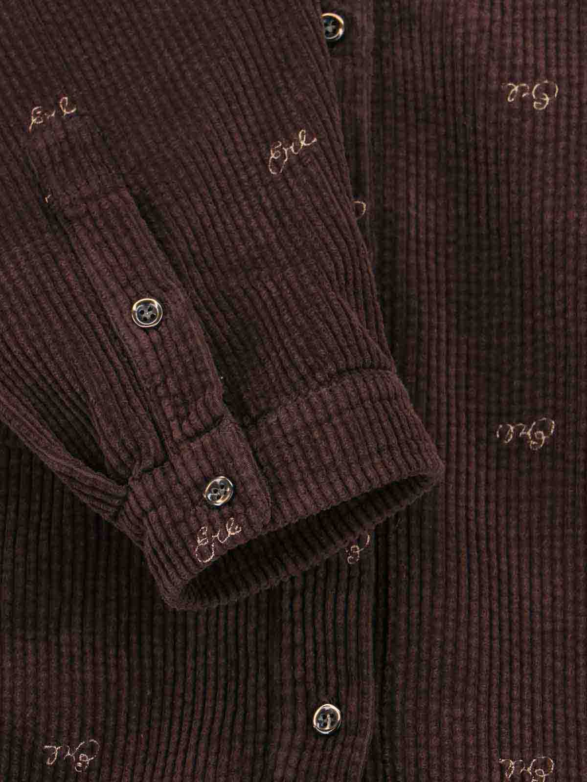 Erl velvet shirt, brown, ribbed workmanship, classic collar, button closure, all-over tone-on-tone logo embroidery, chest pocket, two back pleats, buttoned cuffs, straight hem.
