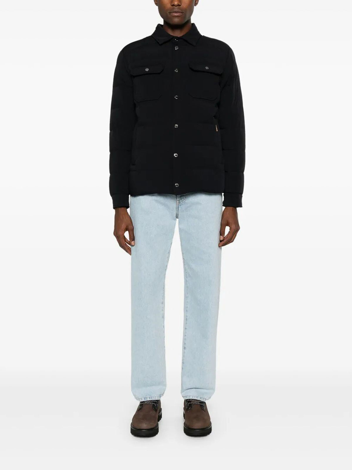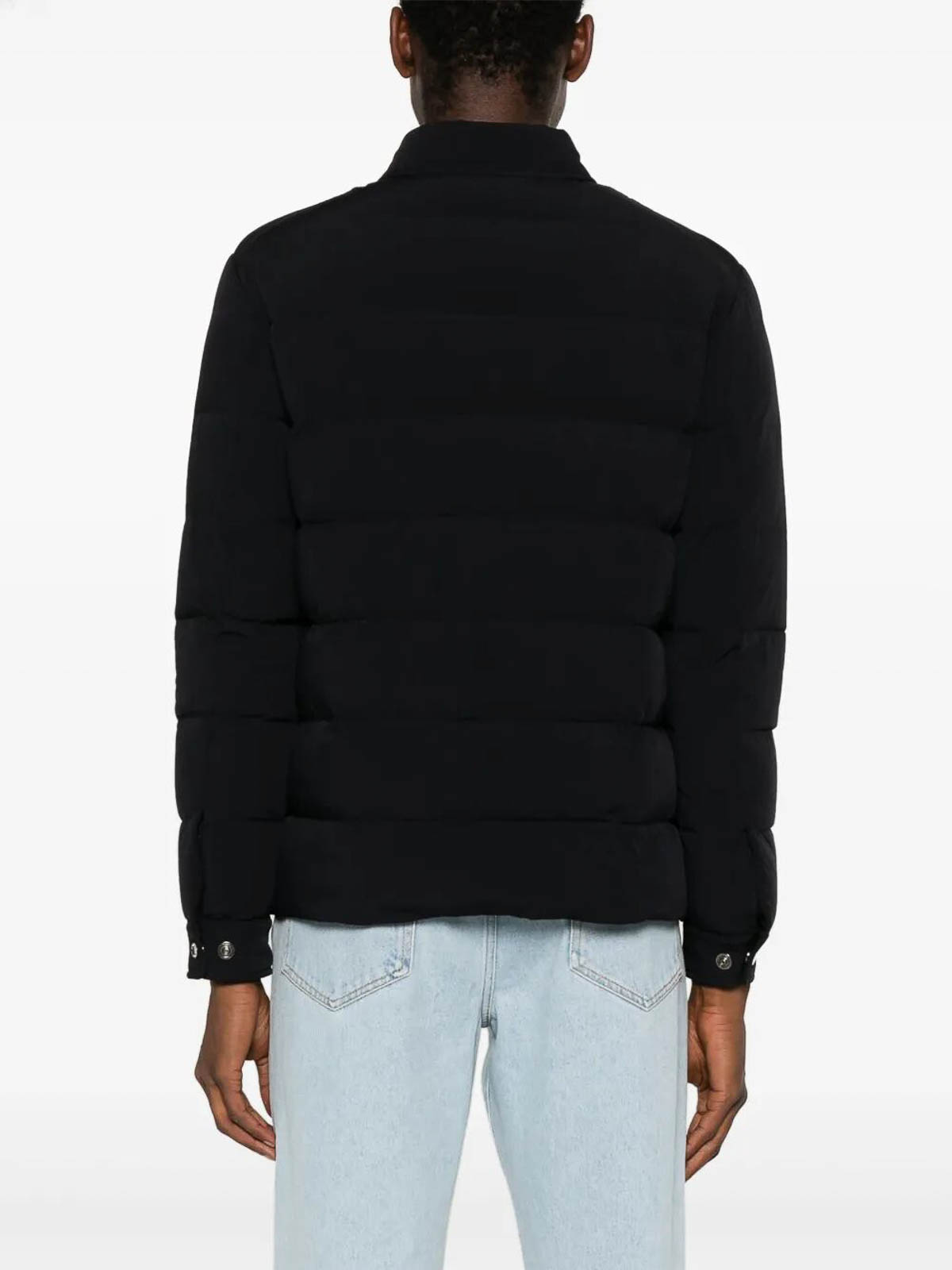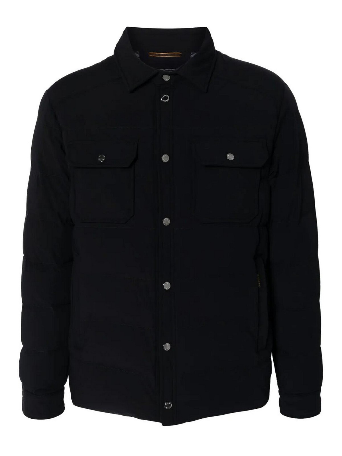 Midnight blue padded design, down jacket, water resistant, shirt collar, long sleeves with snap cuffs, two chest pockets with flap and snap closure, two side zip pockets, front logo, straight hem, internal zip pockets, front snap closure.