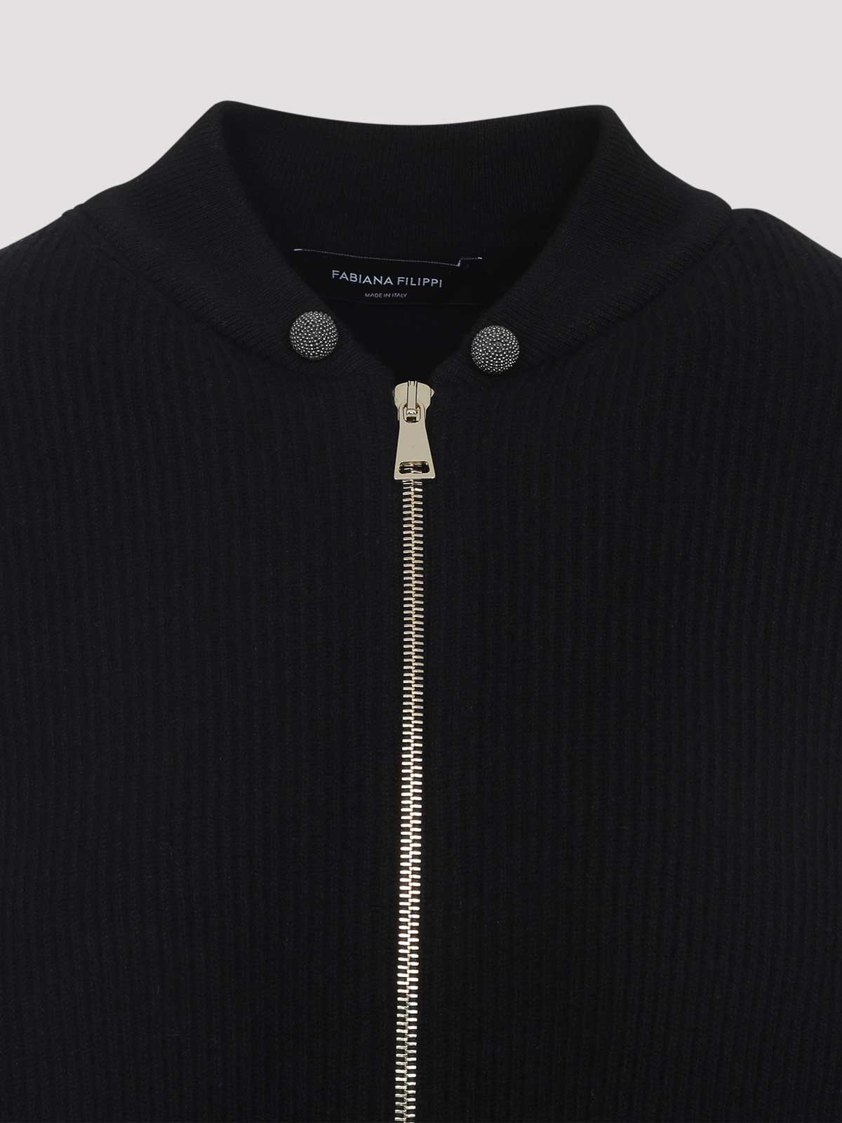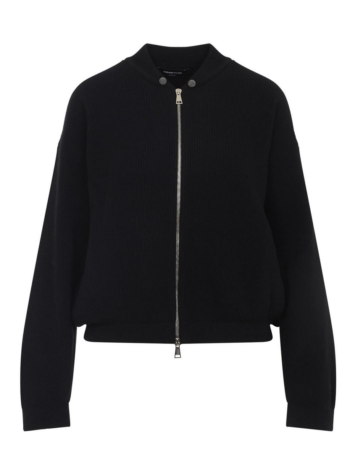 Fabiana filippi black jacket crafted from black ribbed and blend round neckline signature on the two, way zip long sleeves fine ribbed edges