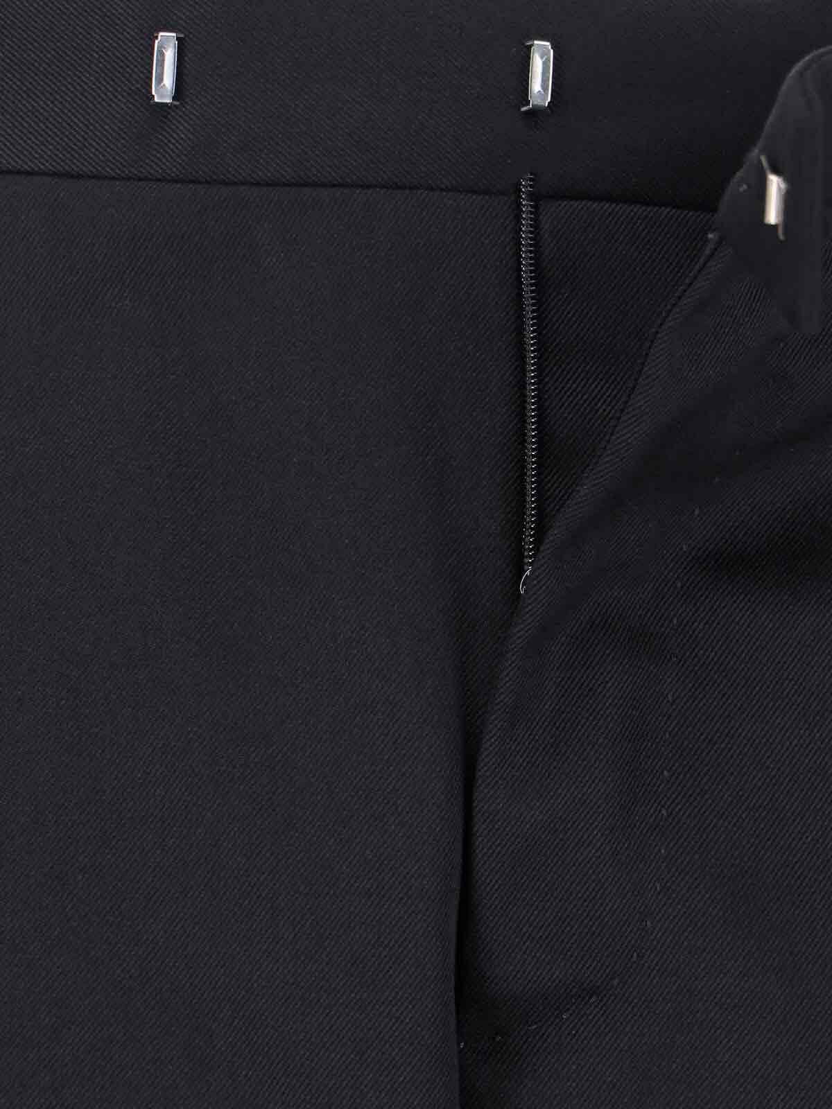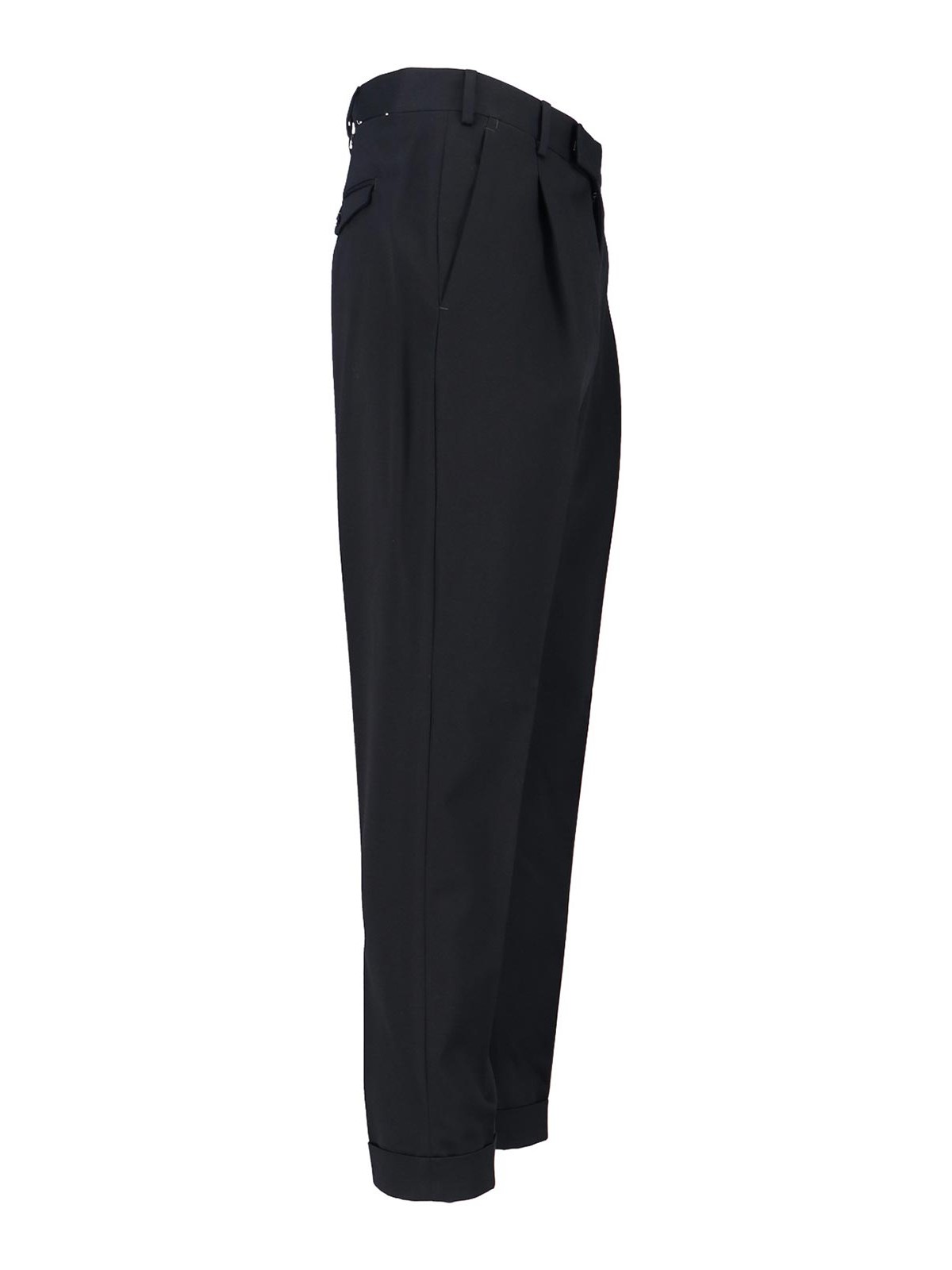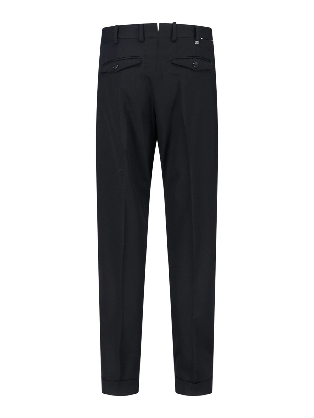 Turin virgin wool trousers, black, medium waist, belt loops, hook and zip closure, front pleats, two side pockets, two back button pockets, silver metal logo detail on the back loop, cuffed hem.