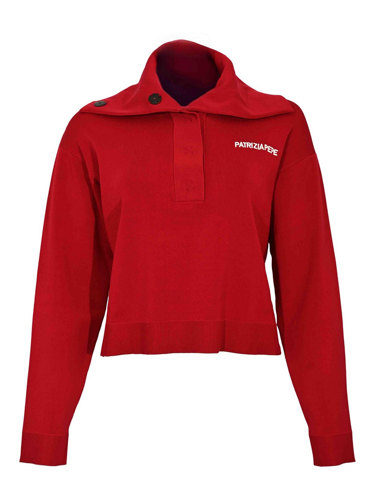 viscose knit polo shirt, patrizia pepe fabric: stretch viscose technical knit pattern: solid color sleeves: long with ribbed cuffs neck: wide with flap and decorative buttons closure: partial front buttoning pockets: none details: patrizia pepe logo embroidered on the chest, smooth knit with ribbed edges, slightly cropped fit, modern and sporty cut lined: no fit: regular